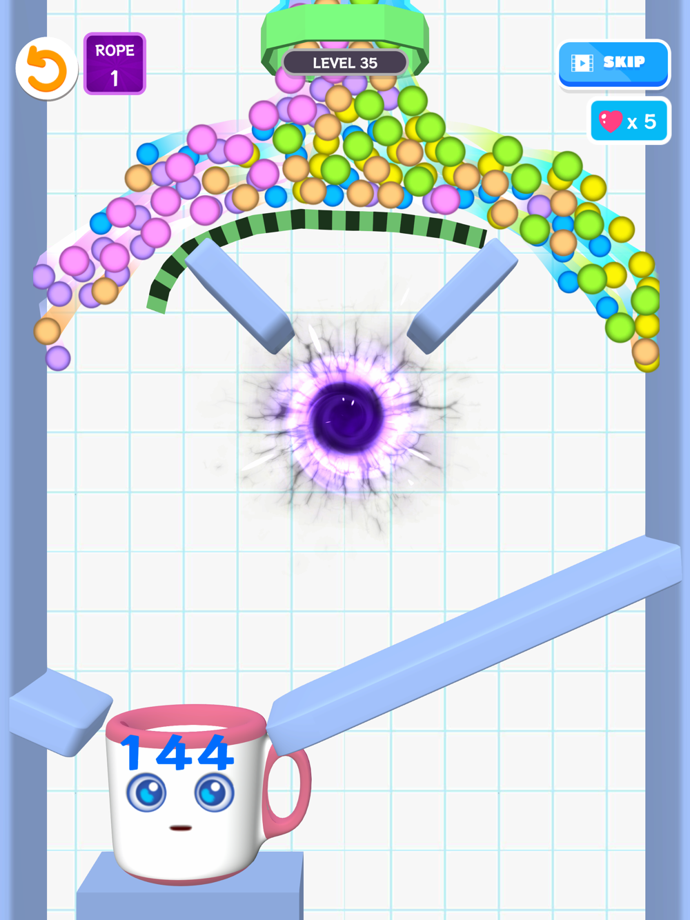 The mechanics are so simple, just draw rope to collect all the balls into the cup!