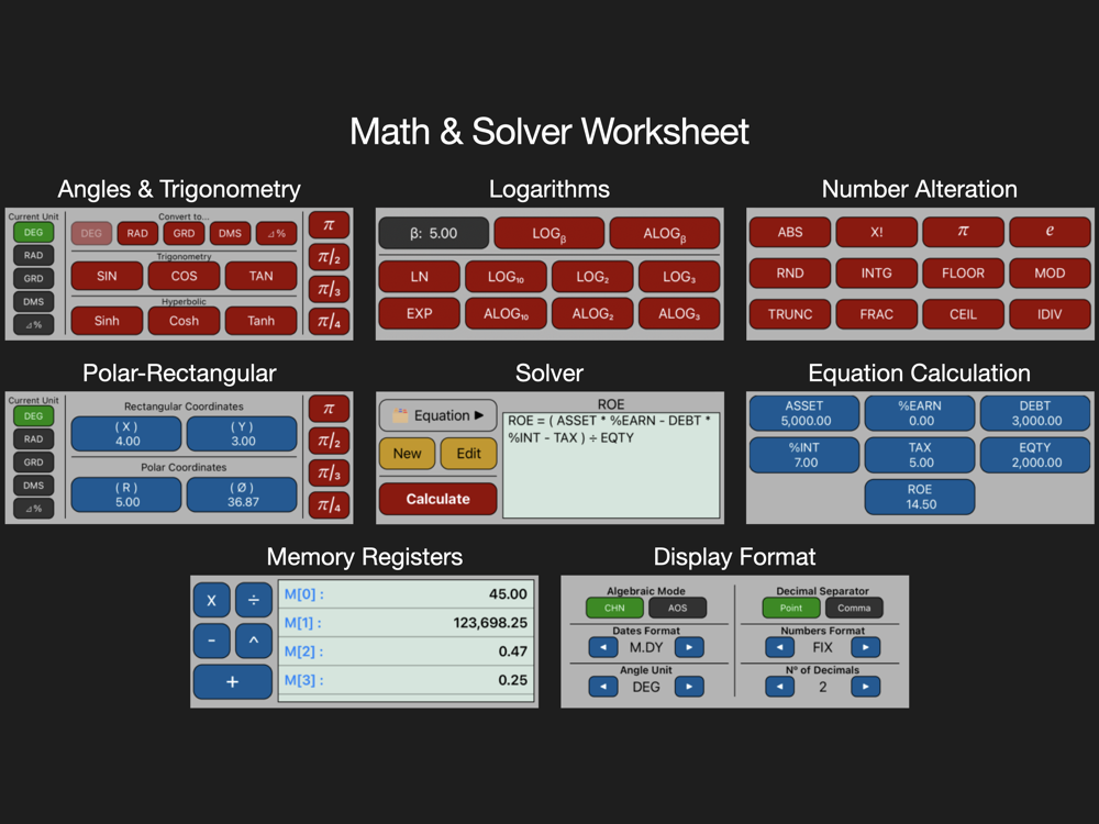 •Angles & Polar: Convert angles between DEG,RAD,GRAD,DMS or Slope % and Polar-Rectangular coordinates.