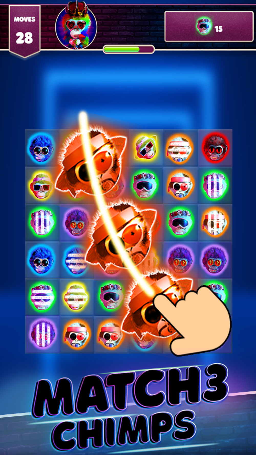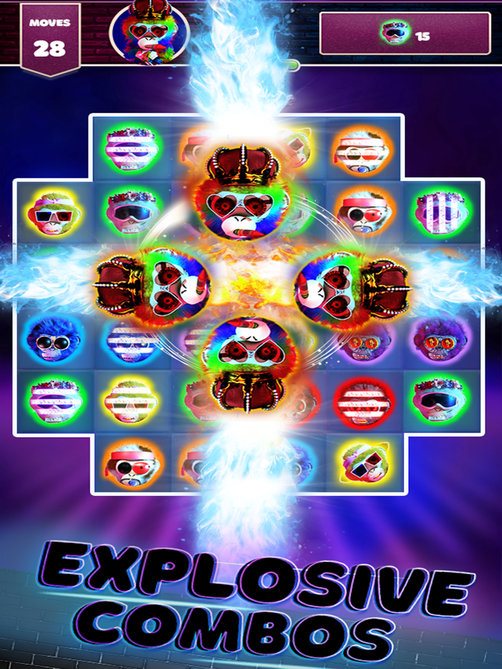 - Match 3 or more of the same color Cheeky Chimps in order to crush them.