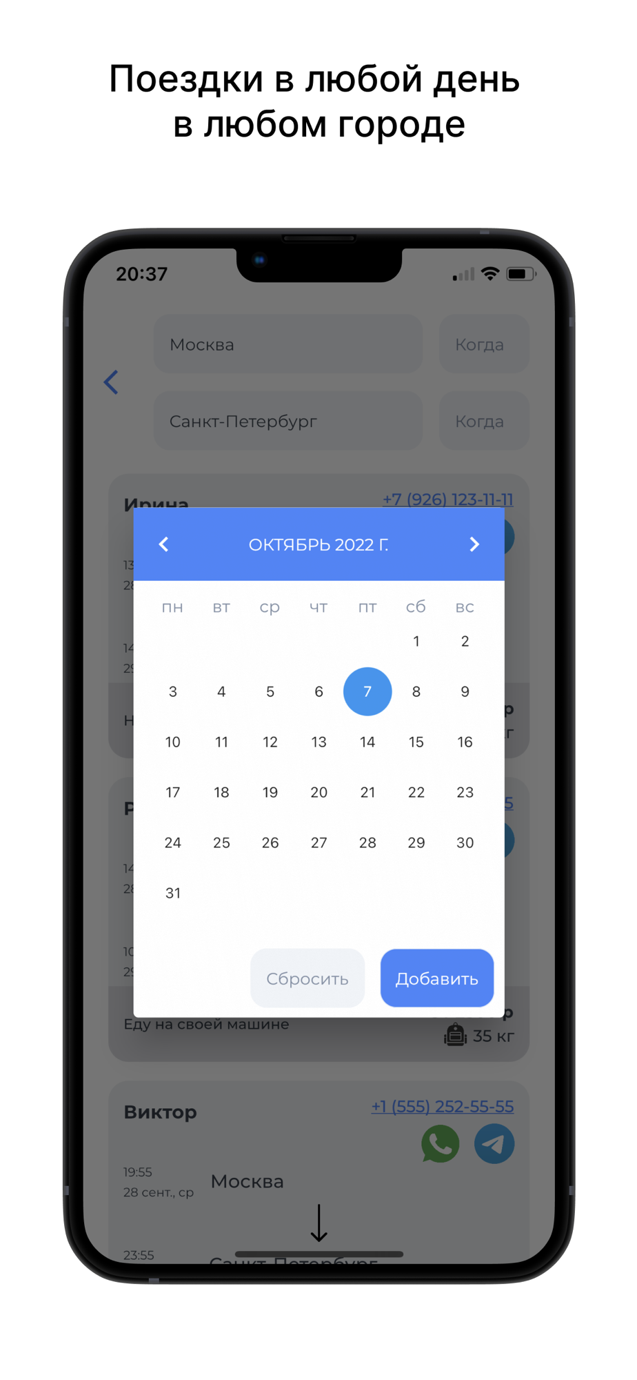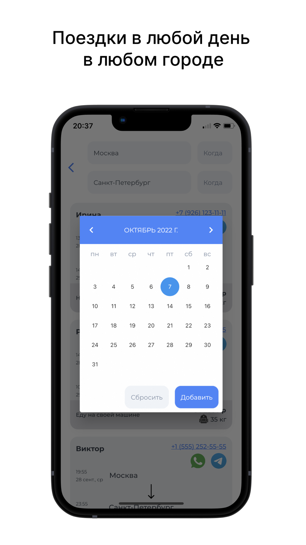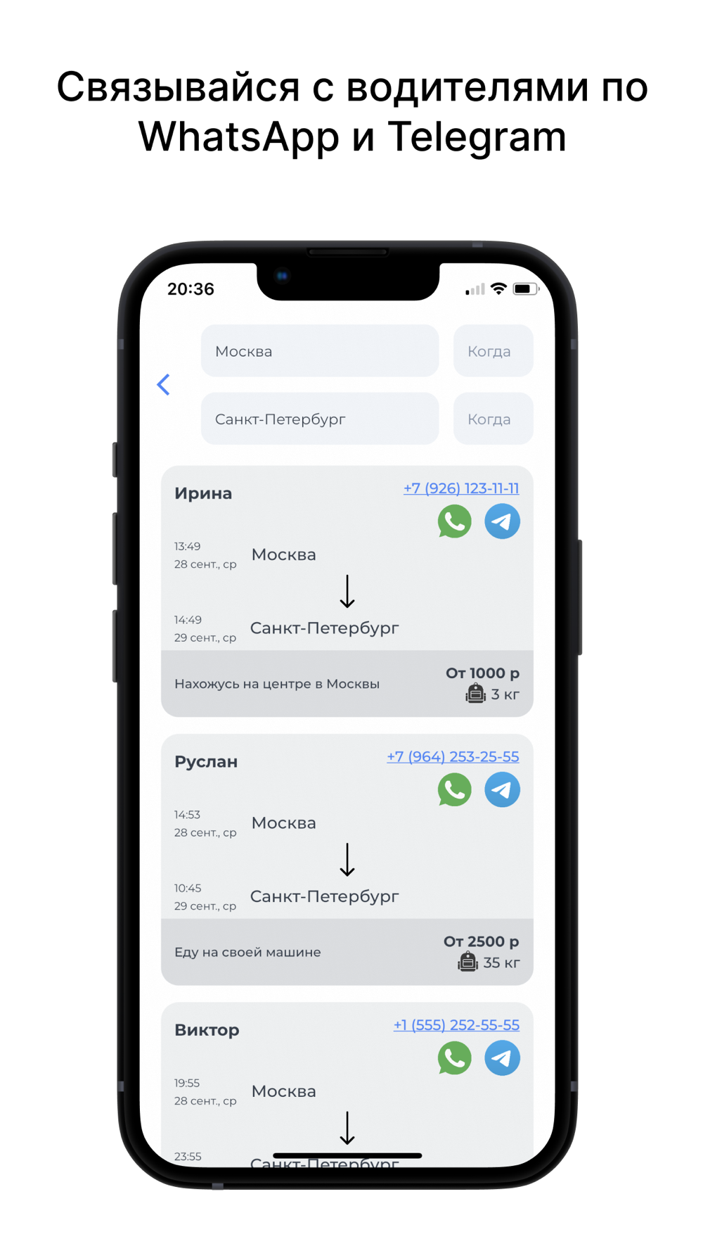 * Найди перевозчика в удобный день и время, и свяжись с ним по телефону или через мессенджеры WhatsApp и Telegram.