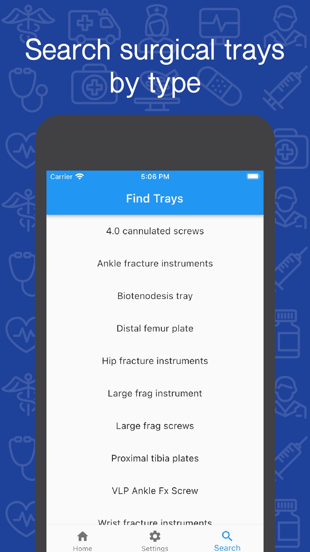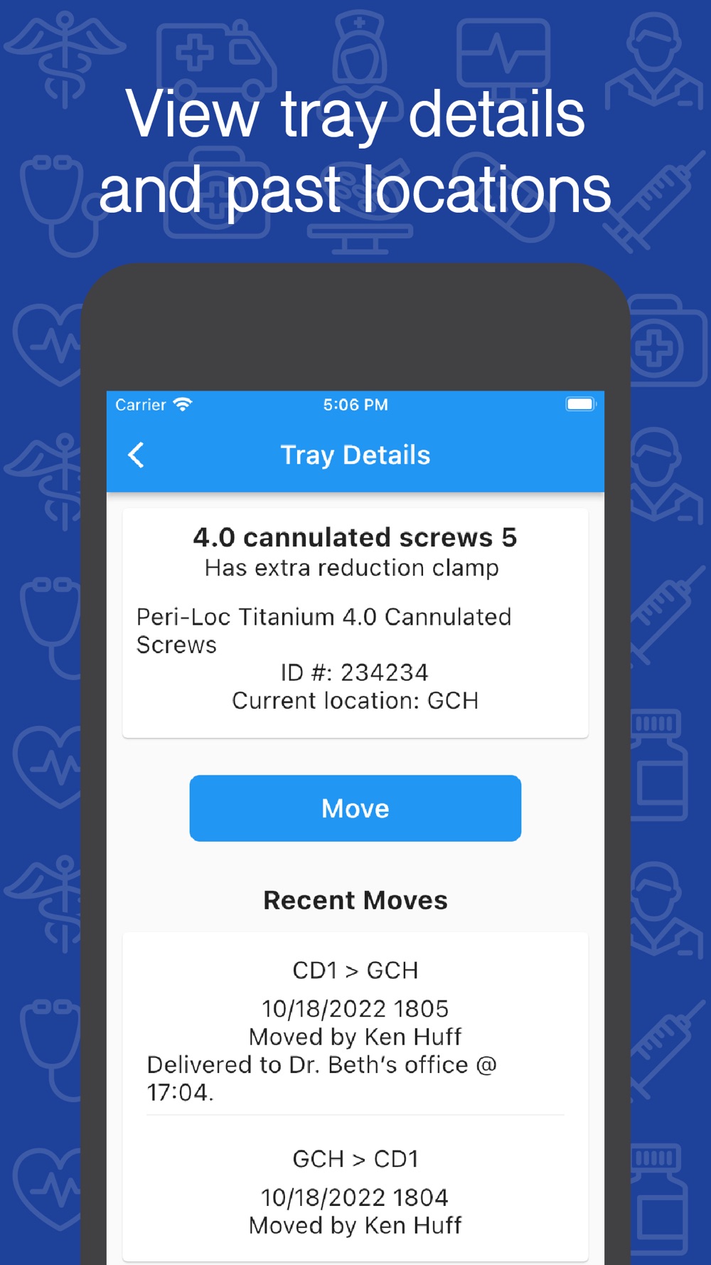 O.R. Tracking Lite allows surgical implant reps to track tray movement between all their facilities and by all their team members. Find the location of a certain tray, see the tray inventory at a certain facility, and see notes about a particular tray.