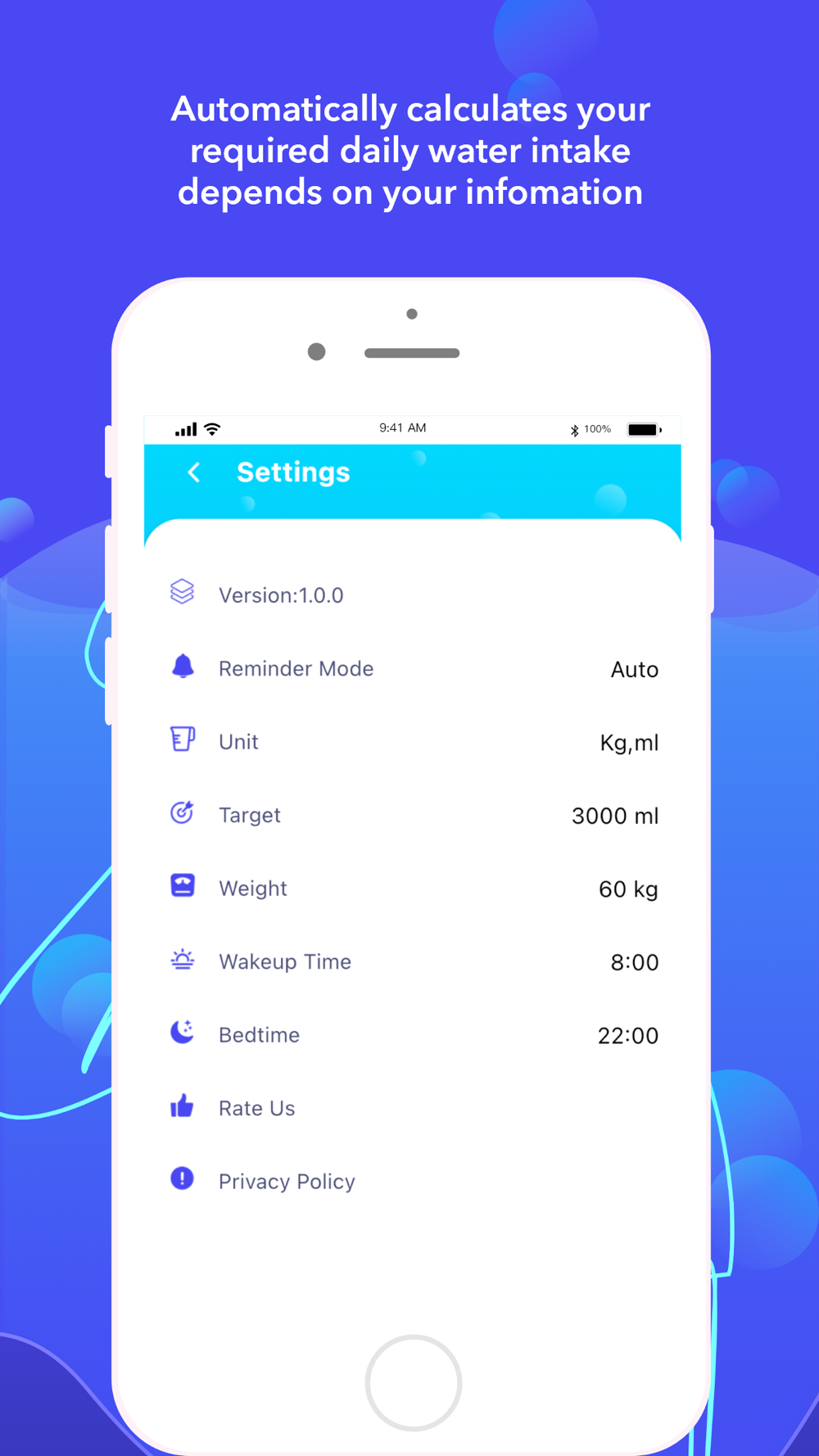 If you do not know how much you need to drink each day , no problem! Our app has a super water calculator to help you. Just enter your weight and Drink Water tells how much you should drink per day.