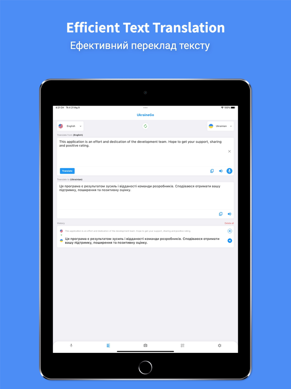 UkraineGo is the leading Ukrainian Translator App with many outstanding features such as accurate voice, text & photo translation from Ukrainian to 45 languages and vice versa.