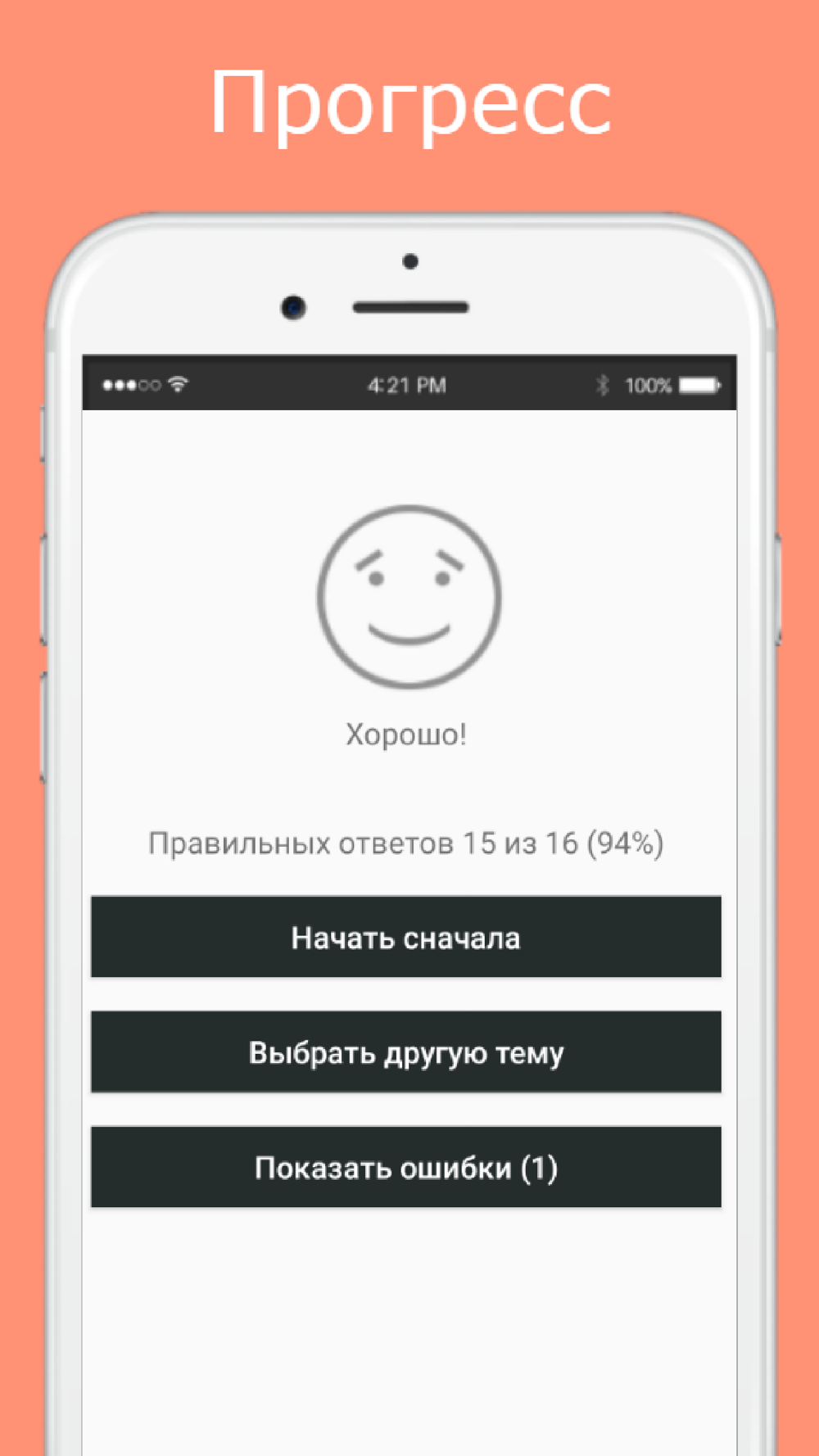 После прохождения теста по выбранной теме, можно просматривать ошибки. Также, результат прохождения теста по каждой из тем сохраняется, ваша цель - выучить все слова в выбранной теме на 100%.