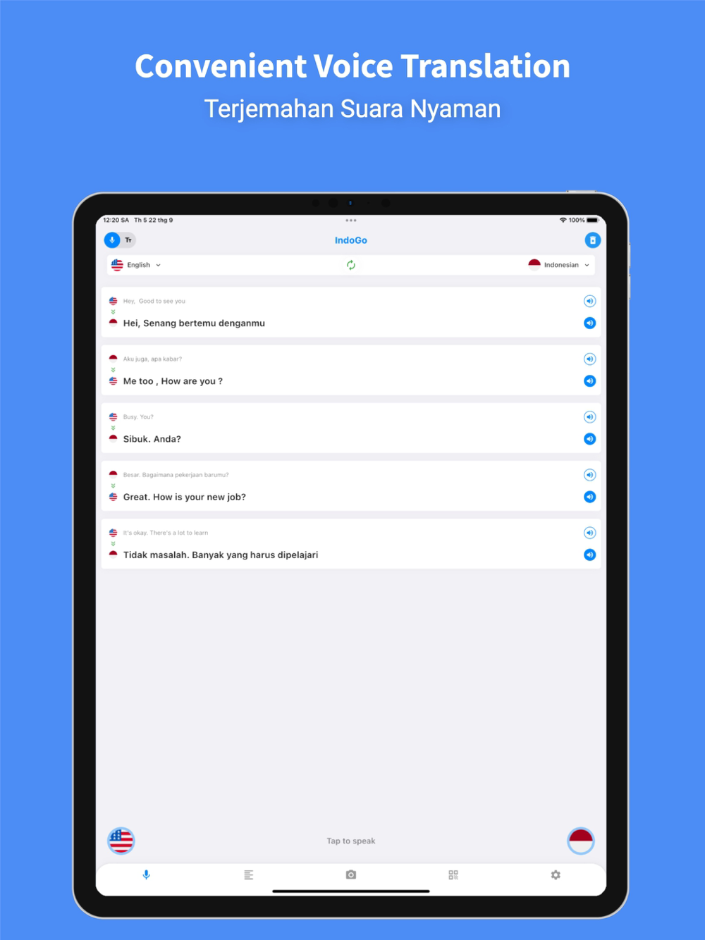 Real-time speech translator to both text and audio, tap-to-play again and learn speaking languages.