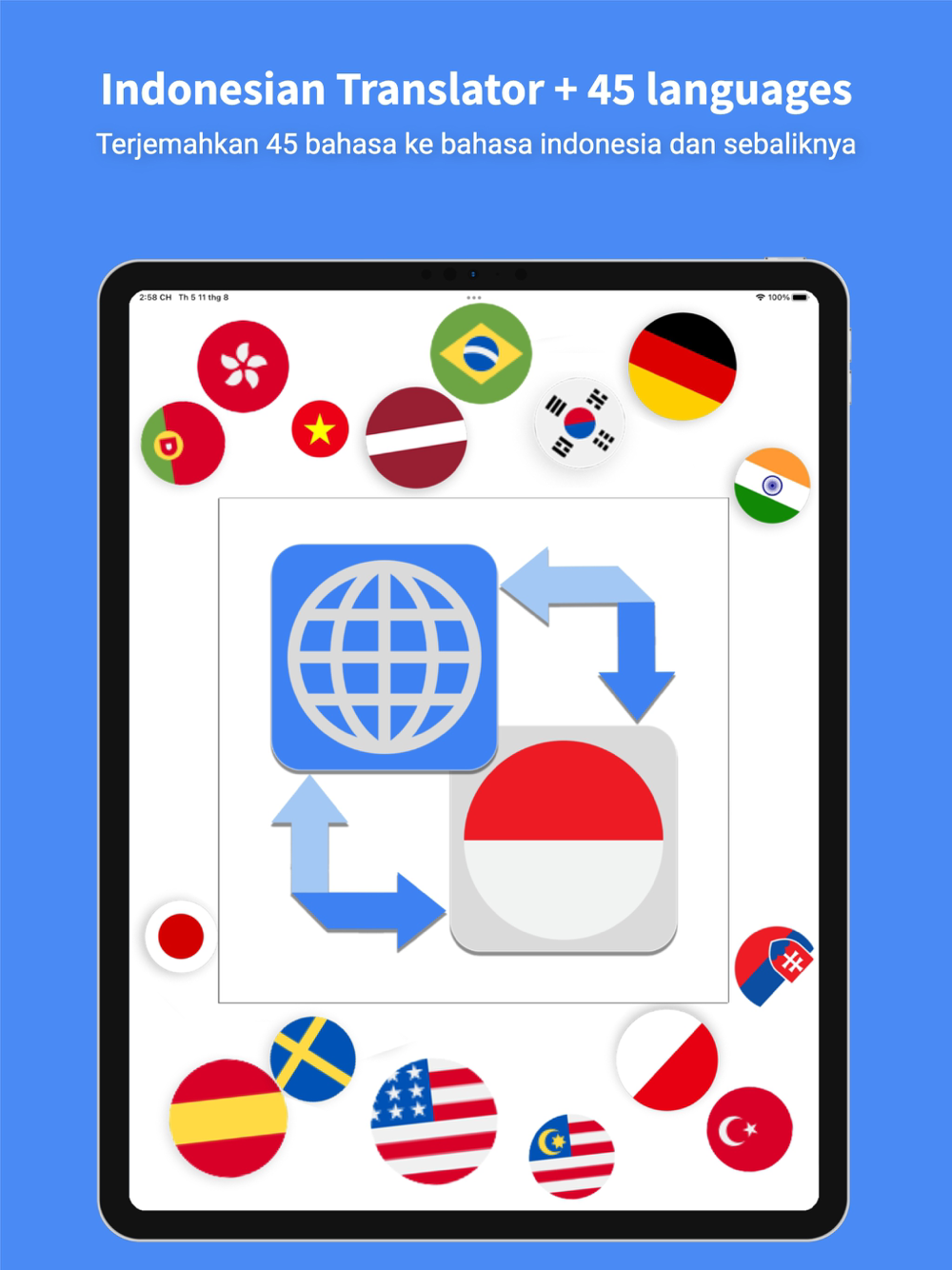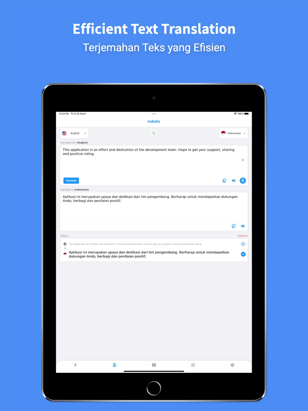 Hi ! IndoGo is the leading indonesian Translator with a lot of outstanding features such as accurate voice translator, translate any text in 45 languages to indonesian or indonesian to any language such as: English, Korean, German, Japanese, Vietnamese, French, etc and extremely useful photo translating feature or learn indonesian more easily.
