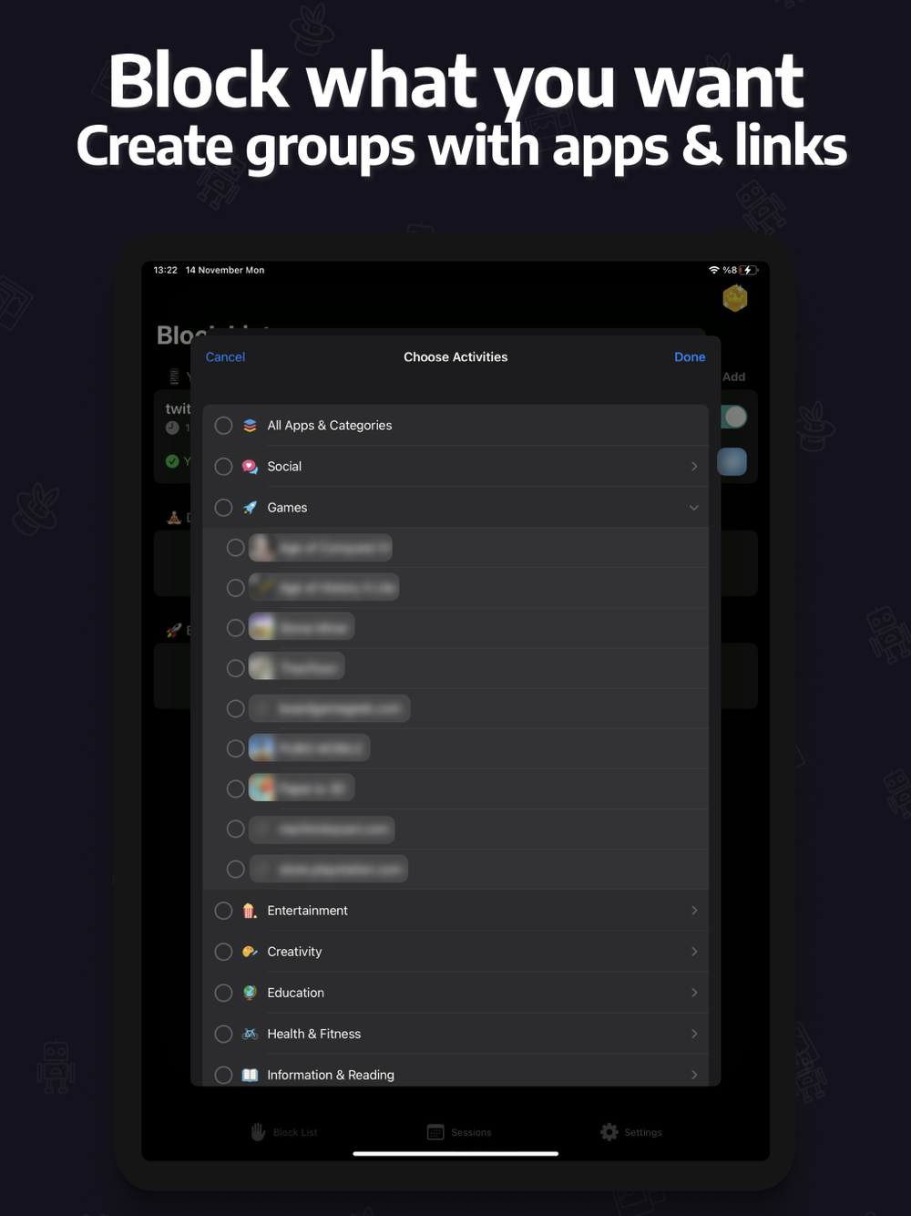 You can define days or hours when blocking is active using Modes. Would you like to block social media at work? Don't want work apps to disturb you at home. No issue. Create your Mode, select the apps you want to block and set the time frame. That is it!