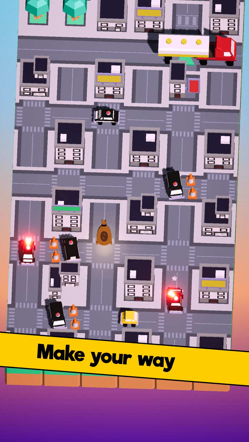 Try to find the best path to collect more money and avoid the police cars chasing you.