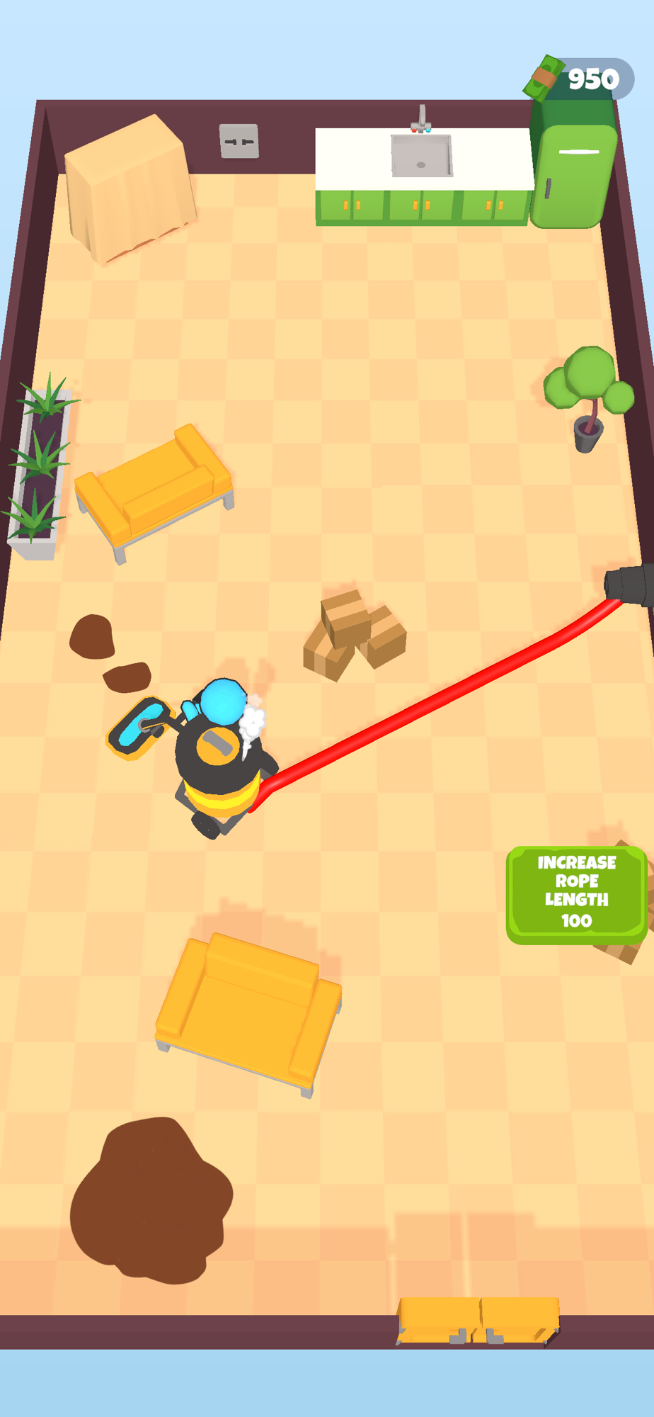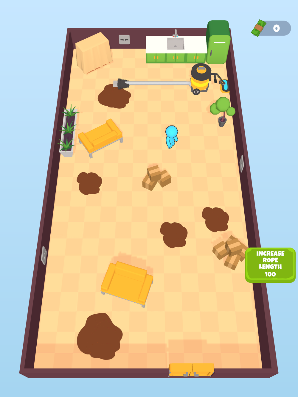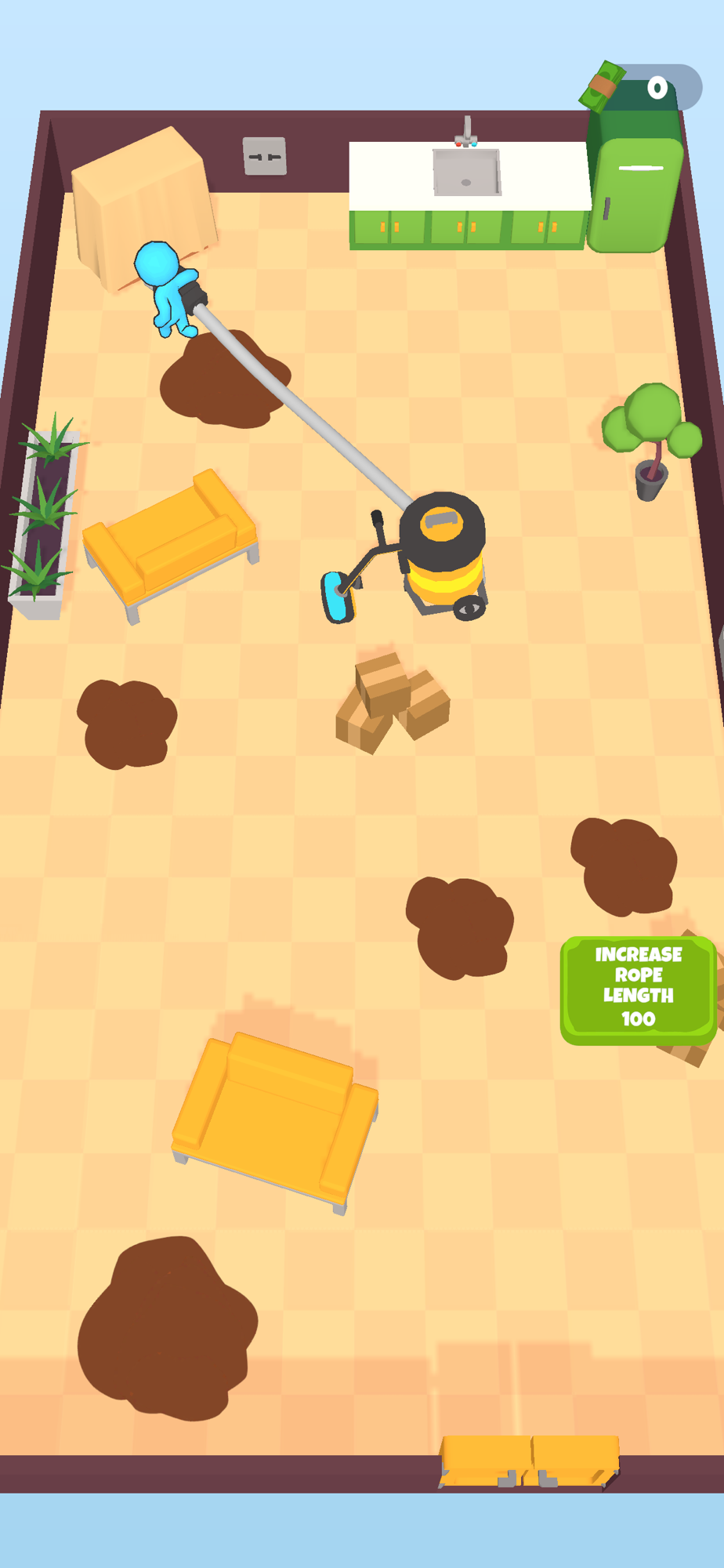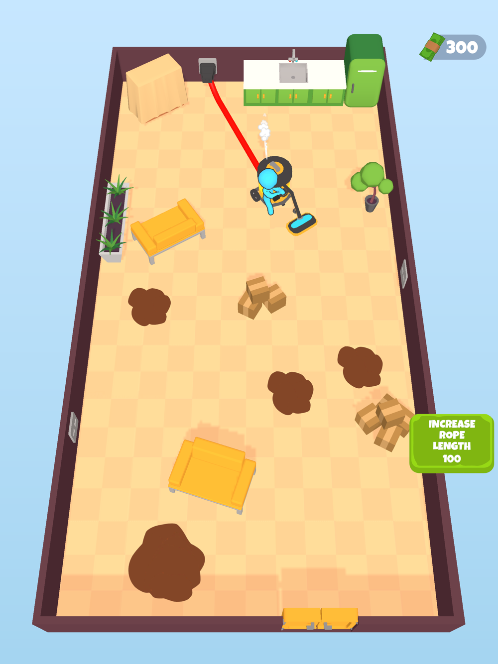 The place is very dirty. Take the plug and plug it in, then start cleaning around. Be careful, your vacuum cable might get caught somewhere. Clean up before tangling the cable. You can extend the vacuum cable with the money you earn.