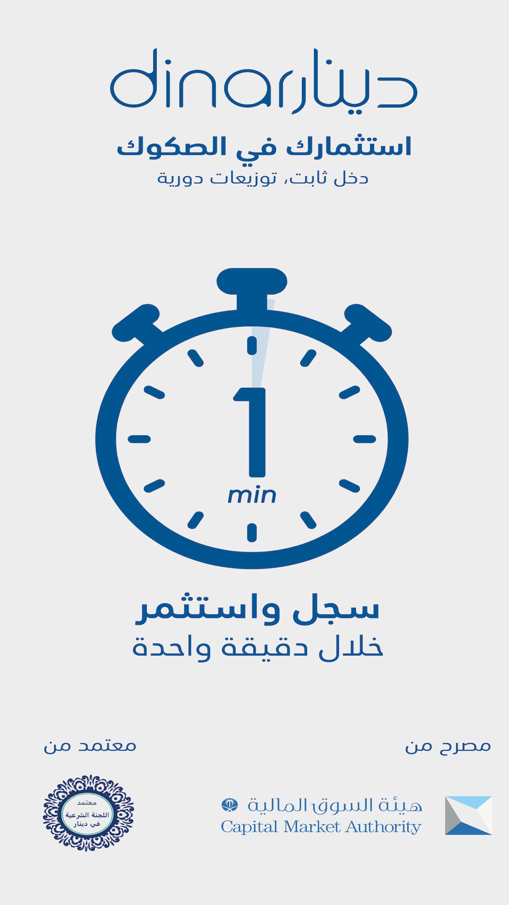 يتيح لك تطبيق دينار الاستثمار بصكوك شركات بمختلف القطاعات بالمملكة العربية السعودية. سجل خلال دقيقتين وابدأ الاستثمار باستخدام (التحويل البنكي , وApple Pay وبطاقات مدى وفيزا وماستركارد).