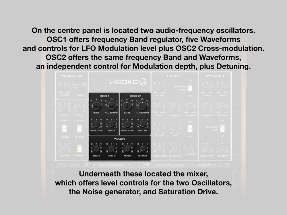 • OSC1 offers frequency Band regulator, five Waveforms and controls for LFO Modulation level plus OSC2 Cross-modulation;