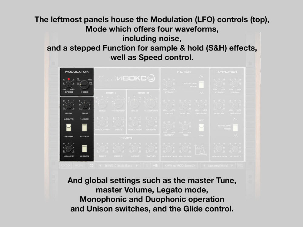 The leftmost panels house the Modulation (LFO) controls (top), Mode which offers four waveforms, including noise, and a stepped Function for sample & hold (S&H) effects, well as Speed control.