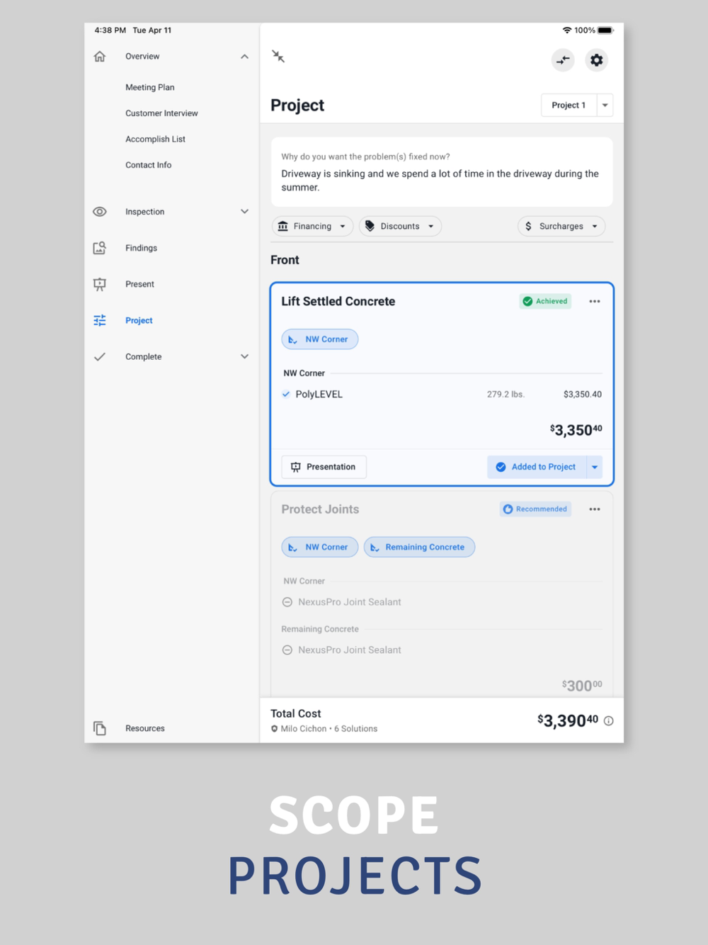 Proposal and Payment – After the presentation, the homeowner is presented with a professional branded proposal and payment can be taken.