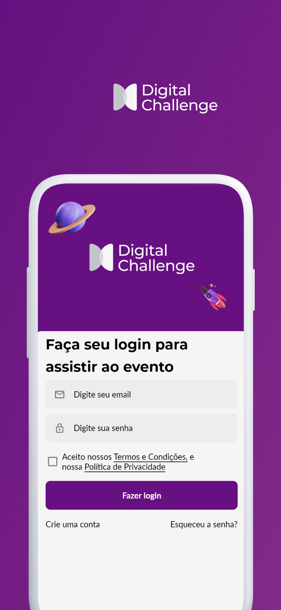 Com o aplicativo do Digital Challenge, você tem acesso a uma rede social exclusiva onde poderá fazer novos contatos, trocar mensagens com outros participantes e interagir com a comunidade, tudo isso durante o evento! Você também poderá consultar a programação, avaliar conteúdos, dar feedback e responder quizzes. Utilize o APP e aproveite ao máximo suas funcionalidades.