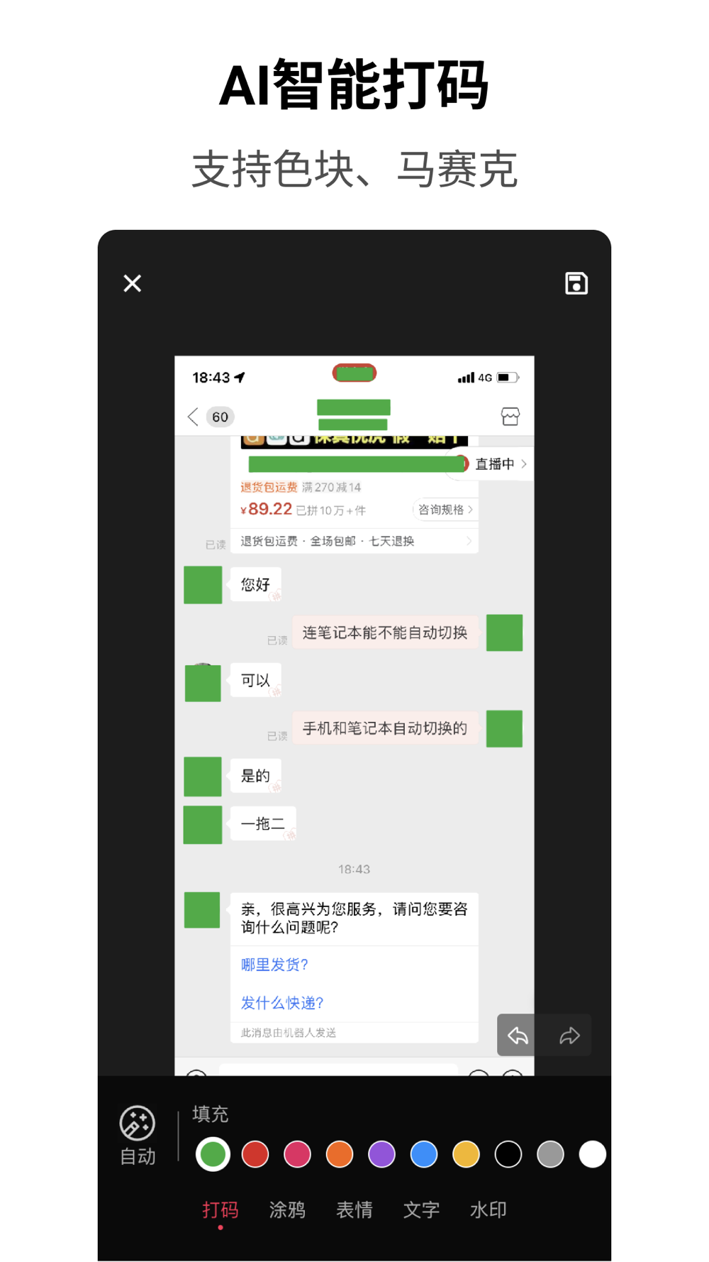 通过机器学习辅助识别智慧场景(目前支持聊天软件截图场景),快速进行打码。