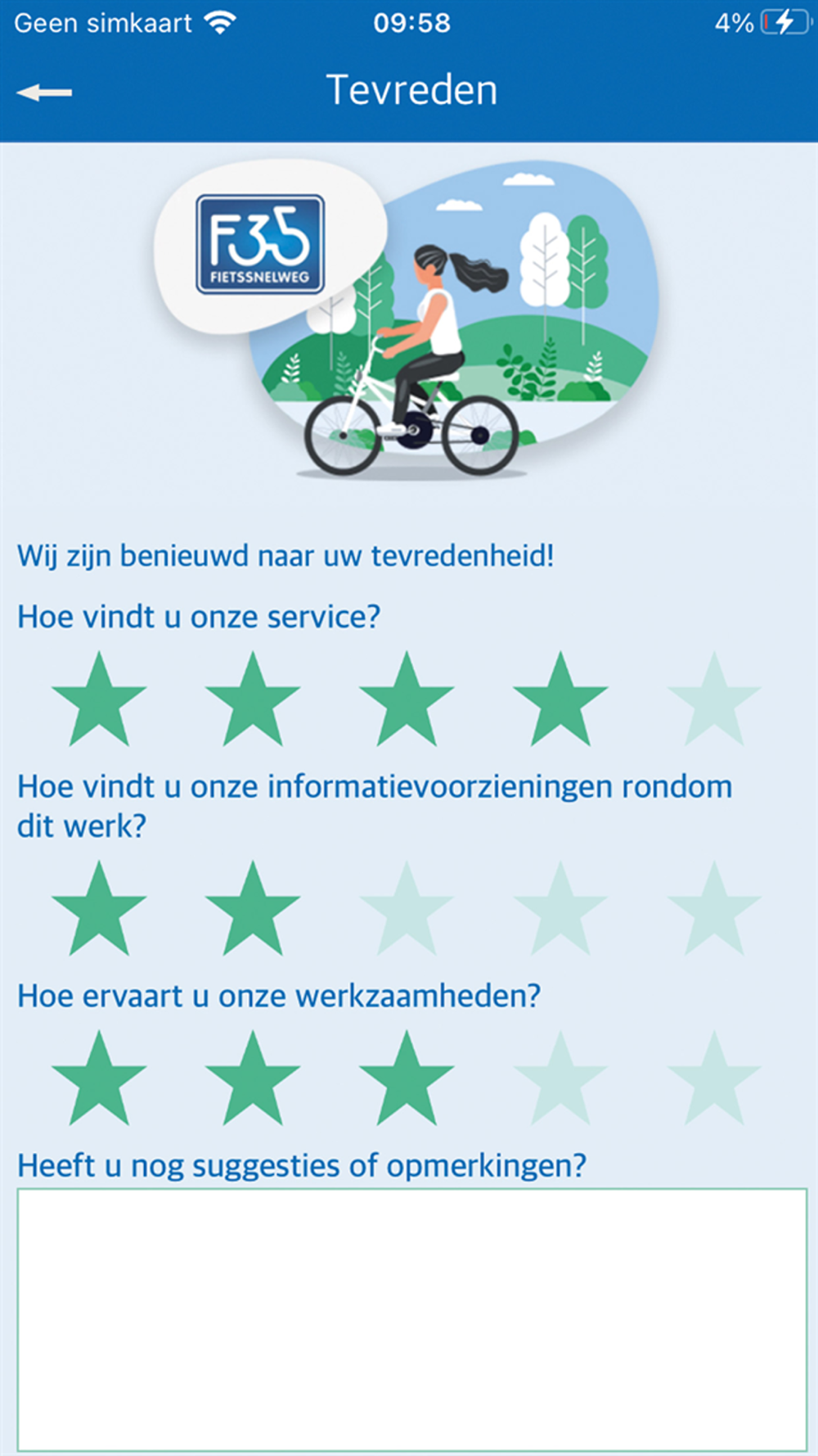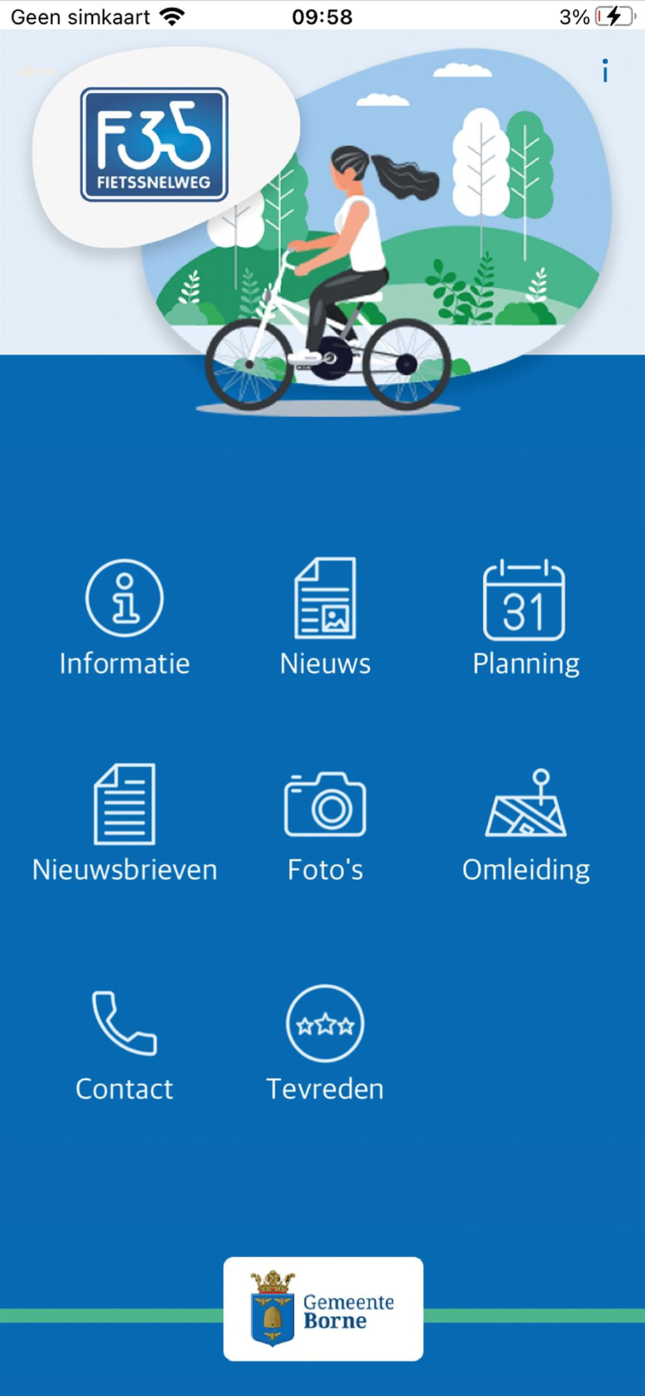 In deze app vindt u alle informatie over de werkzaamheden van het project 'F35 Borne'. Er wordt belangrijke projectinformatie, de laatste planning en contactinformatie weergegeven . Ook kunt u op deze app vragen, opmerkingen of klachten achterlaten die betrekking hebben op het project.