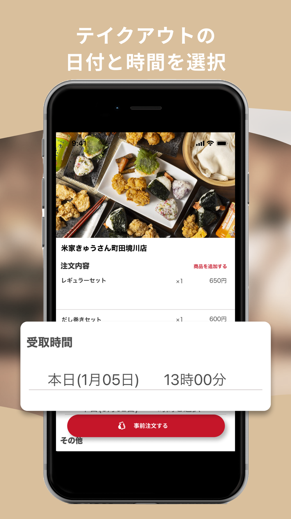 受け取りたい時間を指定し、アプリ内でラクラク簡単に事前注文・決済を済ませることができます。