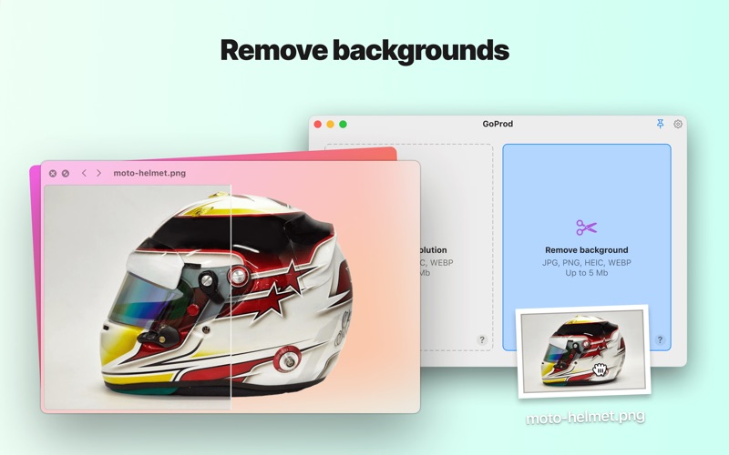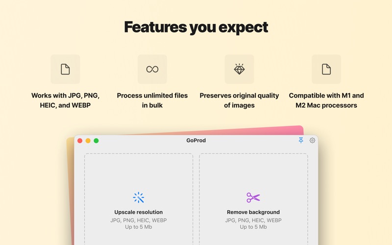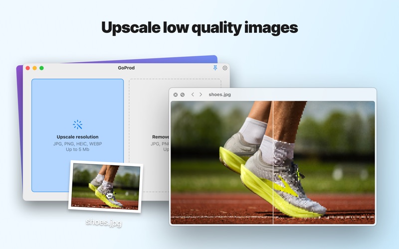 GoProd is an image upscaler and background remover in a single app. Powered by AI, it is an absolute no-brainer. Drop your images onto the app window and get the resulting images a few moments later.
