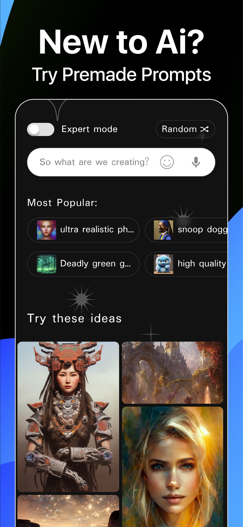 Get even better results by picking a style like (Cyberpunk, Dali, Fantasy, Retro, Sci-Fi, 3d Art, Photography, Painting, and dozens more).