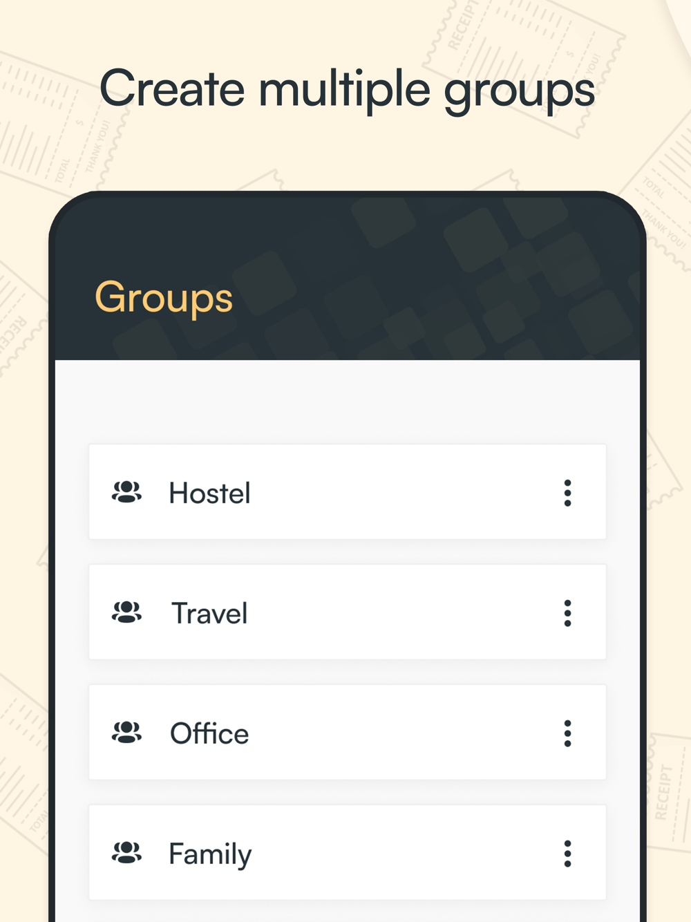 Create groups for different activities, add partners and expense categories to assign each person the cost down to the penny, and keep a track of shared expenses in one place.