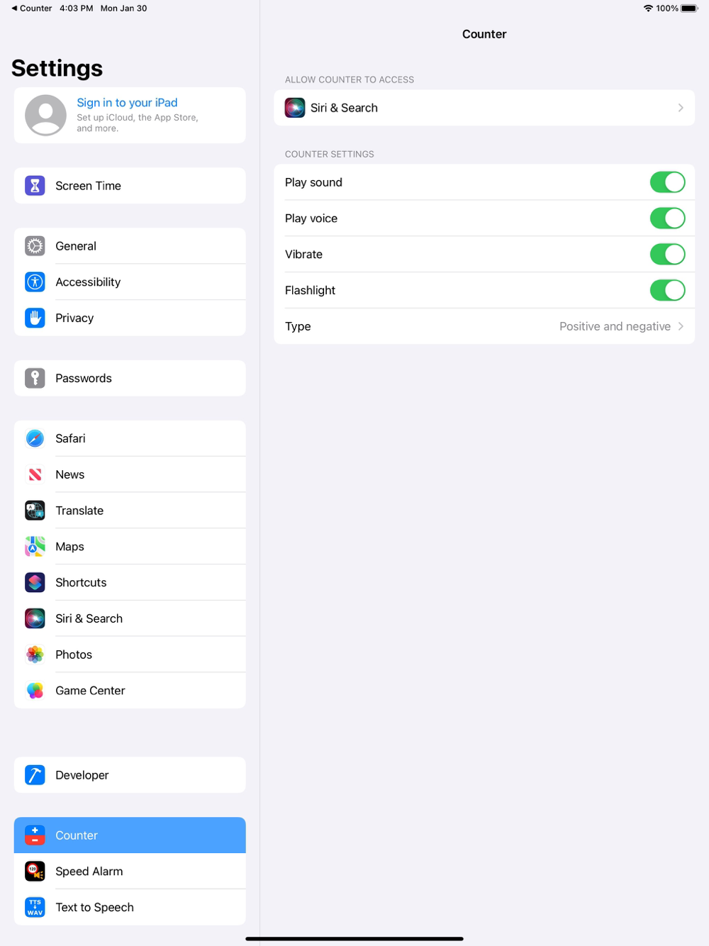 * When counter value changes, the app will play voice / play sound / turn on and off flashlight / vibrate.