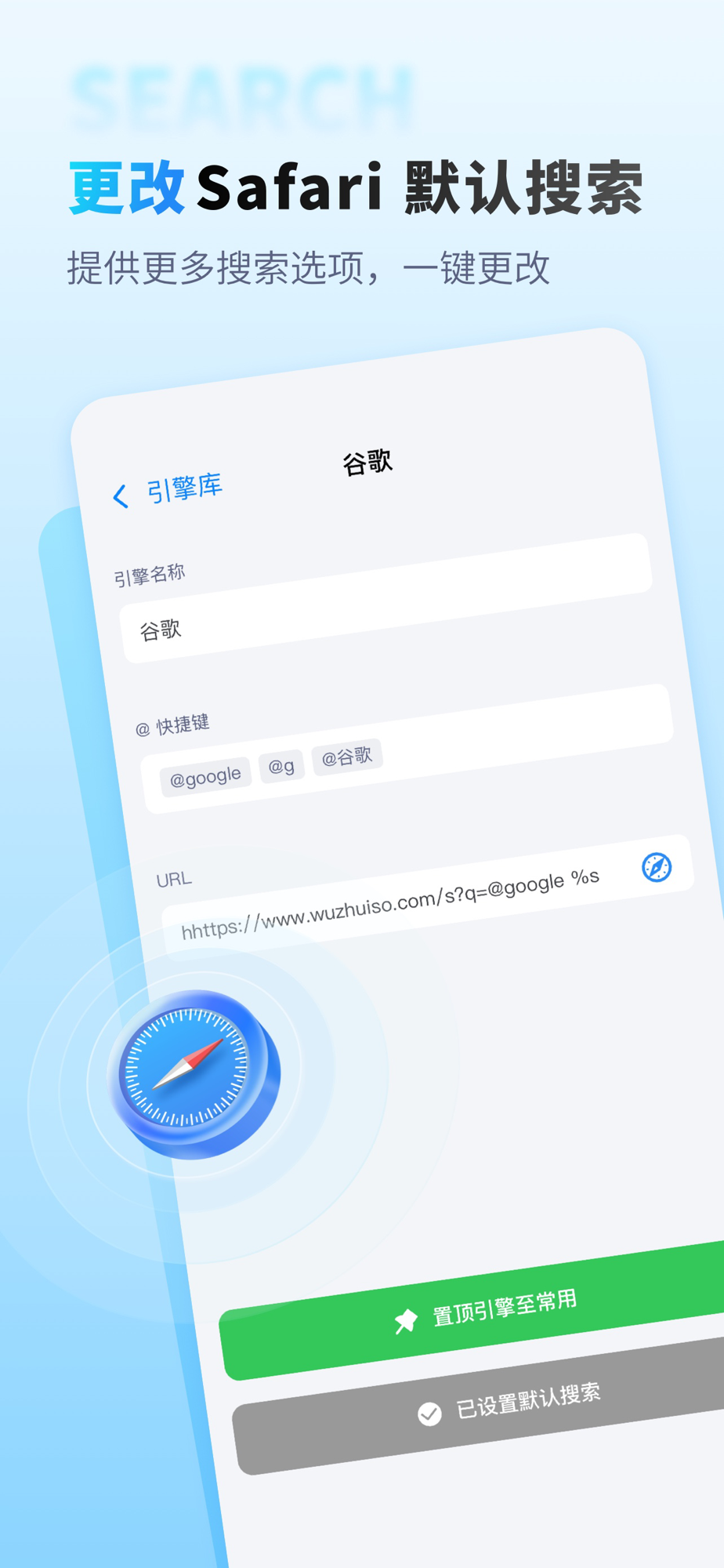 不仅局限于Safari内的少数搜索,提供更多搜索引擎选项,一键更改Safari默认搜索引擎