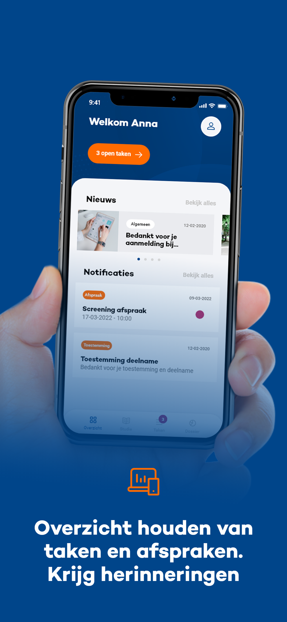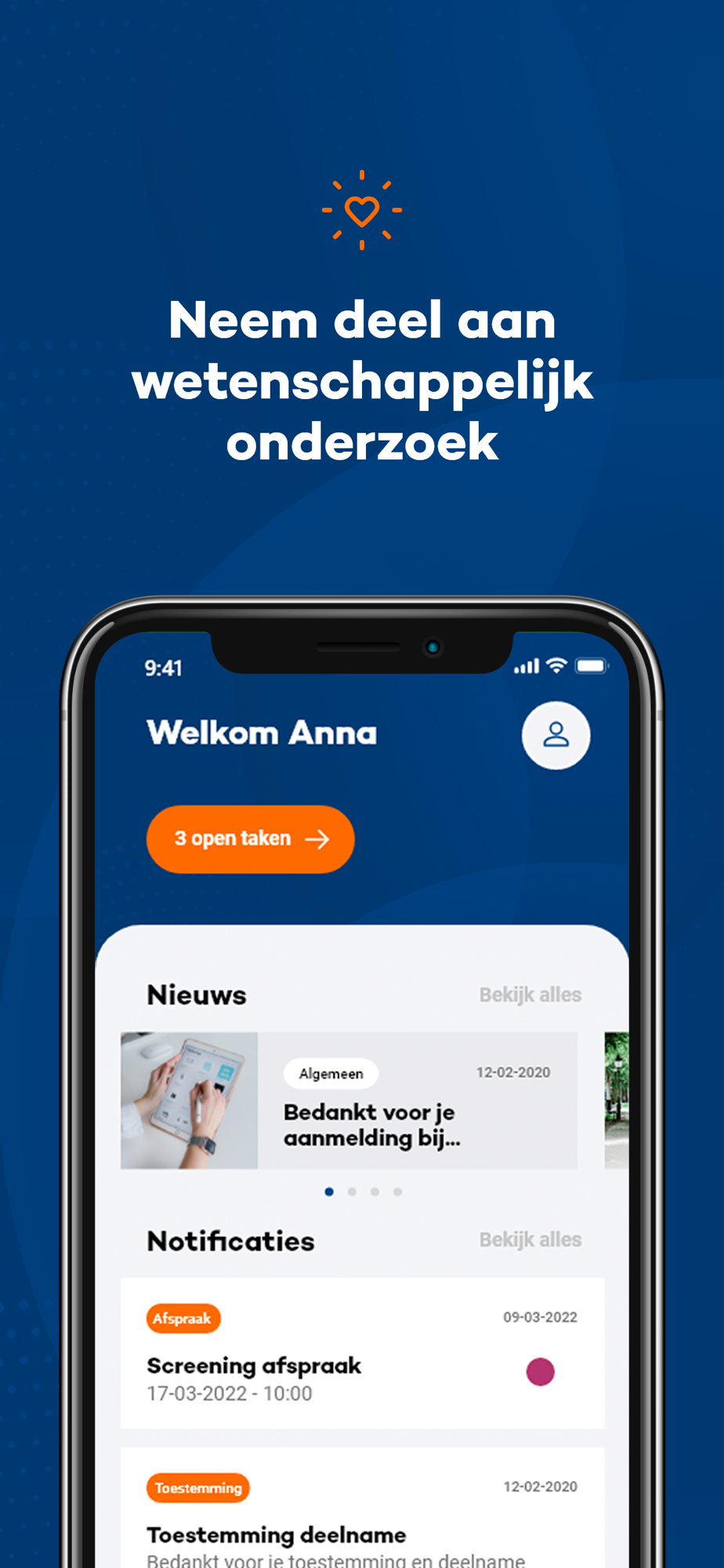 - Inschrijven* als u geïnteresseerd bent in deelname aan wetenschappelijke studies. Zonder verplichting om deel te nemen. Als er een voor u geschikte studie is krijgt u via de app daarover bericht.