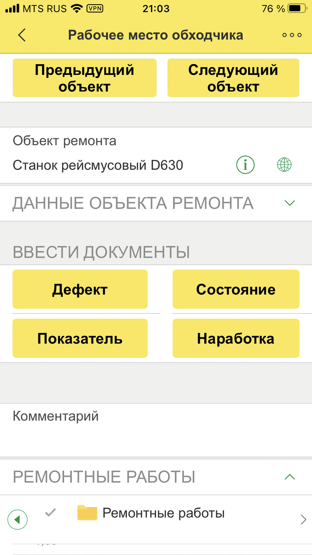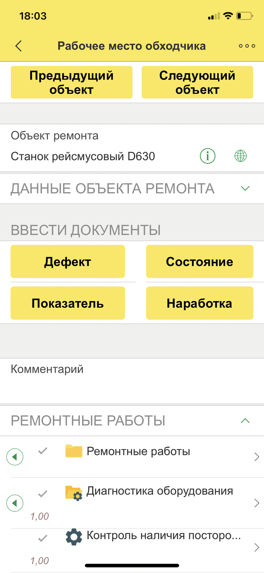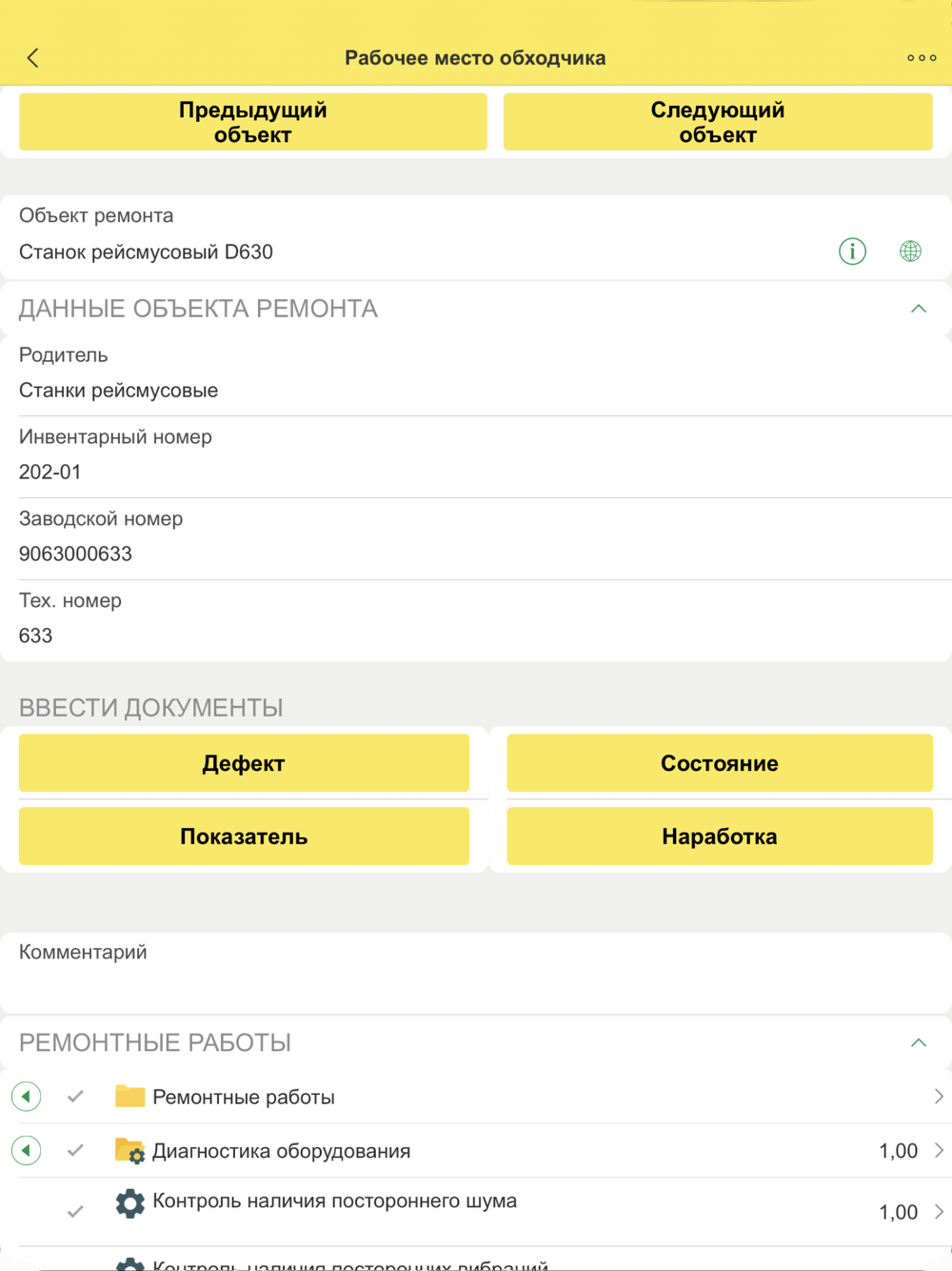 • Обход объектов по списку регламентного мероприятия с сопутствующим вводом контролируемых показателей, значений наработки, регистрацией дефектов и фиксацией состояний оборудования.