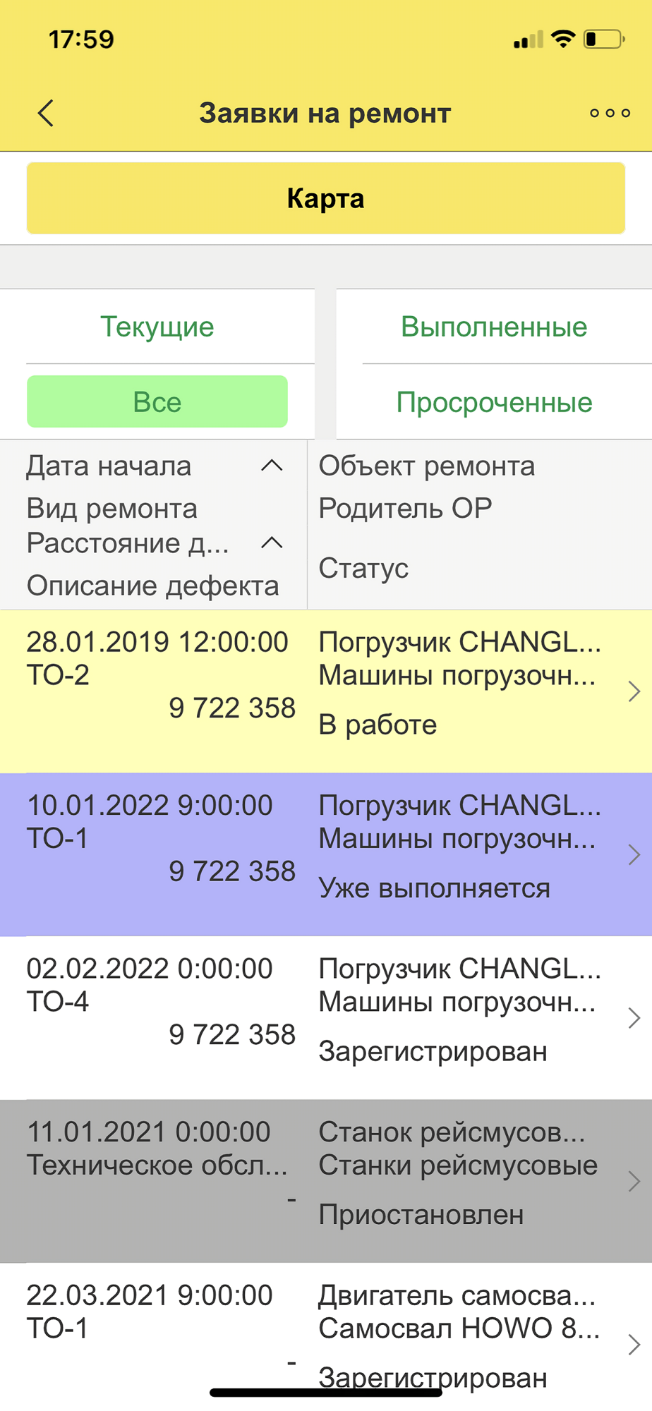 • Цветовая маркировка списка заявок позволяет быстро определять их статус (в зависимости от критичности дефекта, состояния, критичности оборудования или вида ремонта). Например, заявки на ремонт могут быть маркированы разными цветами в зависимости от их статуса: «Зарегистрирован», «В работе», «Приостановлен», «Выполнен» и др.