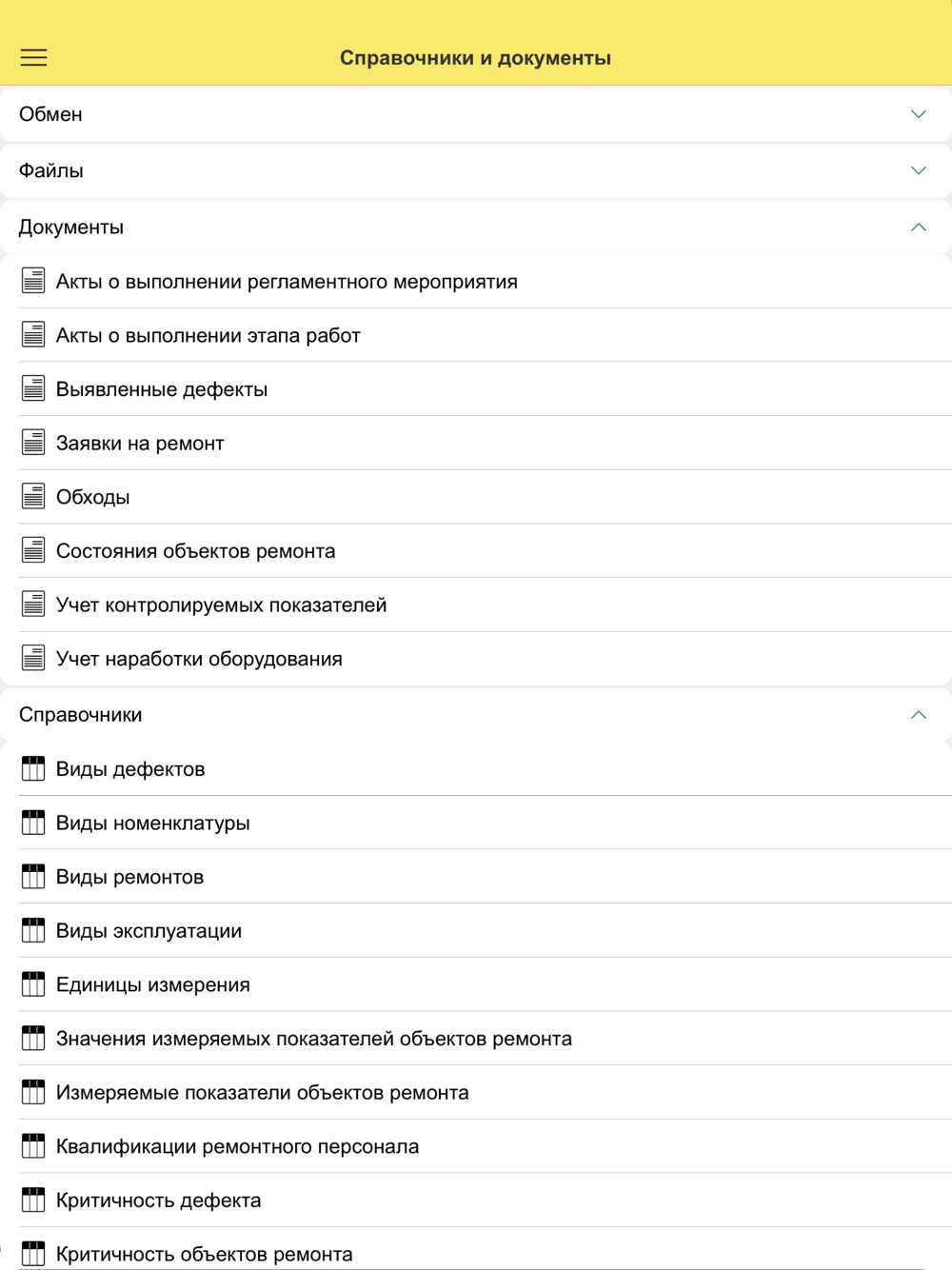 Пользователи имеют доступ к информации в системе 1С:ТОИР КОРП, чтобы получать задания на ремонты, маршруты обходчика (наряды на регламентные мероприятия), необходимую справочную информацию, а также оперативно отражать факт выполнения работ, передавать документы, аудио- и видеофайлы, фото, геокоординаты, сканированные штрих-коды, NFC-метки объектов ремонта, созданные на мобильном устройстве, в базу 1С:ТОИР КОРП.