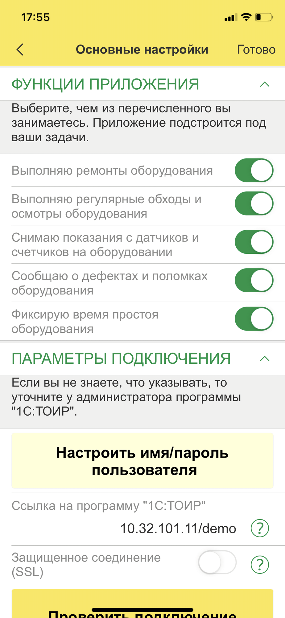• Контроль присутствия персонала на объекте (по NFC-метке, штрих-коду, геолокации). Можно выбрать настройку в 1С:ТОИР КОРП, чтобы ввод документов (актов выполненных работ) был доступен пользователю мобильного приложения только в том случае, если он находится рядом с объектом ремонта.