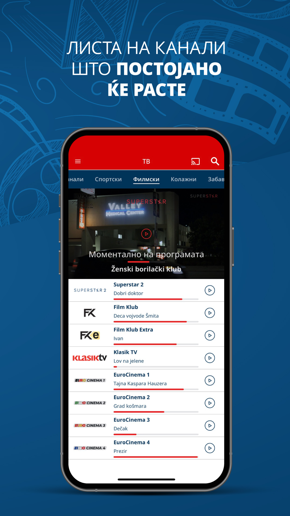 So mPLAY TV uzivajte vo videoteka so najdobrite regionalni serii i filmovi, kako i live TV prenos od najinteresnite kabelski kanali od Balkanot na edno mesto. Superstar, Toxic TV, Agro TV, K1, Balkan Trip, Euronews Serbia, Arena eSport se samo del od kanalite kade mozete da gi gledate najnovite filmski serii od produkcijata na Telekom Srbija, aktuelni muzichki izdanija, programi so vozbudlivi reportazhi od Balkanot, vesti od zemjodelstvoto i informativni nastani od poleto na kulturata i svetot.