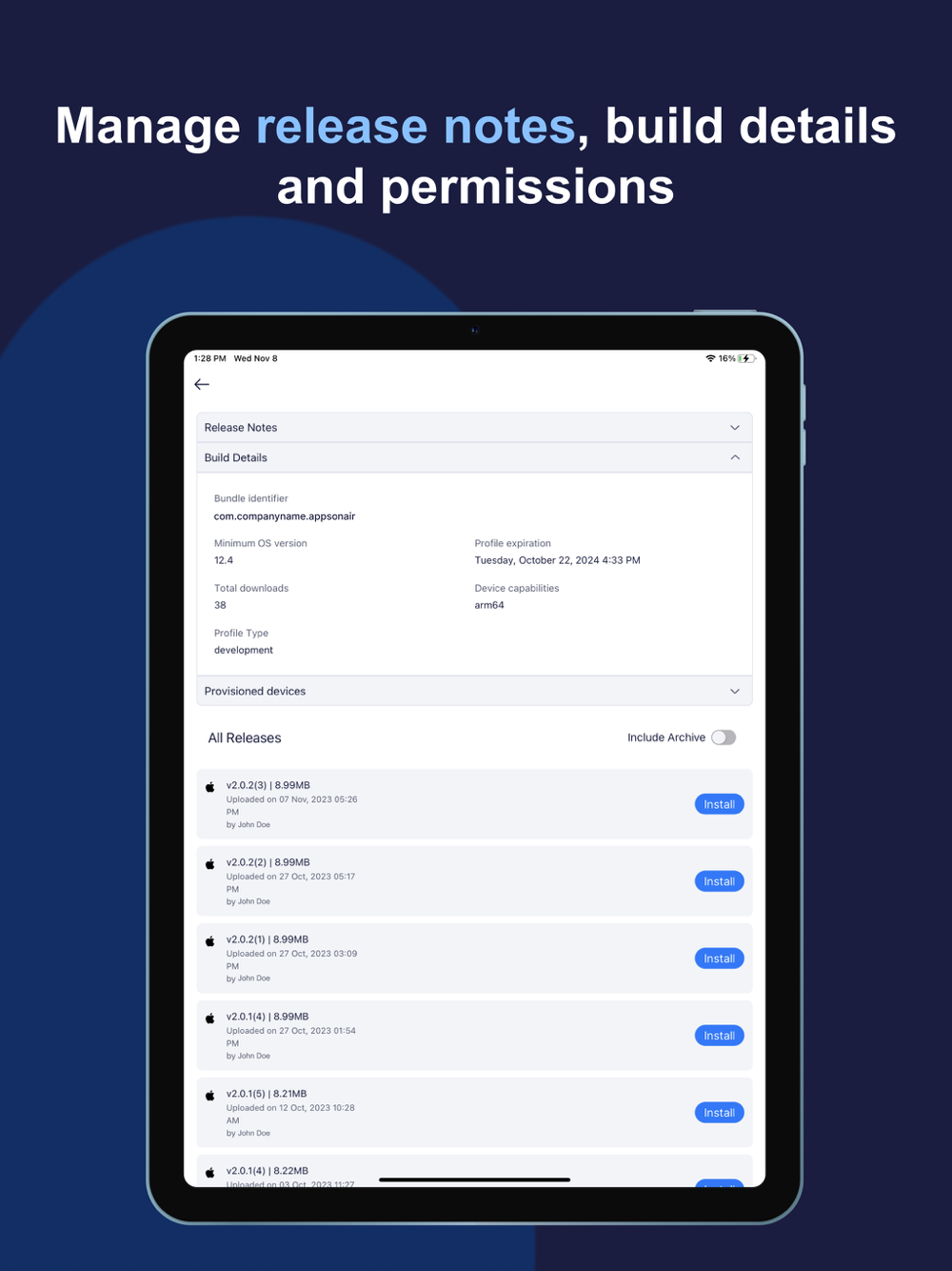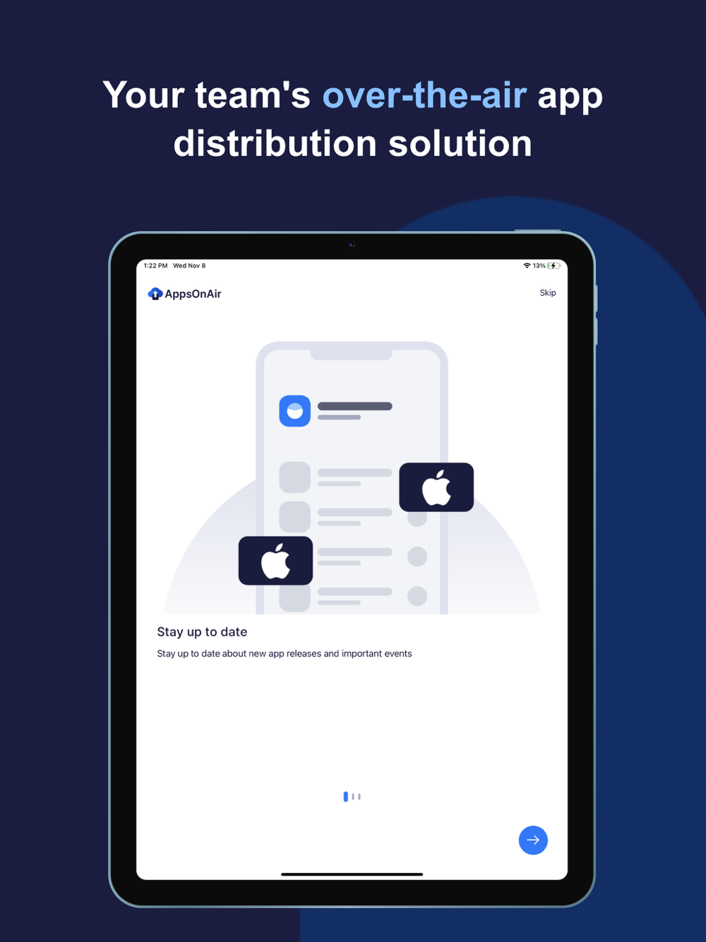 AppsOnAir is your solution to invite in-house teams or clients or anyone you want to share app releases with. Upload your IPA file for iOS and simply submit. AppsOnAir comes with a mobile app to see all releases directly on your phone and instantly send notifications about a new app release or use a custom link to share your apps. Protect your build with links that are password protected or share them publicly. You can also assign permissions and set a password to generate a private link for each app. All the versions of the build uploaded and deployed are preserved and you can roll back to a previous version and restore it instantly. Additionally, keep track of all the basic stats like releases, uploads, and downloads and check how many users have downloaded your builds. With AppsOnAir you can empower your app testing and beta distribution timely and accurately.