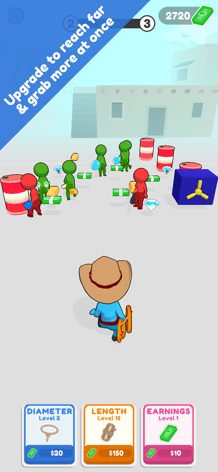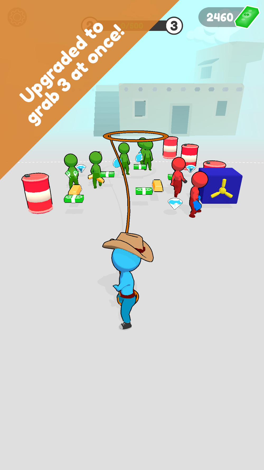 Upgrade your lasso and grab the green rich stickmen along with all the valuable items in the field.