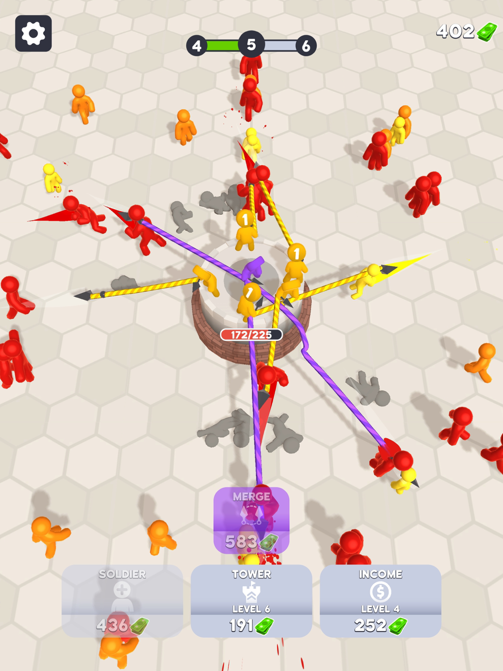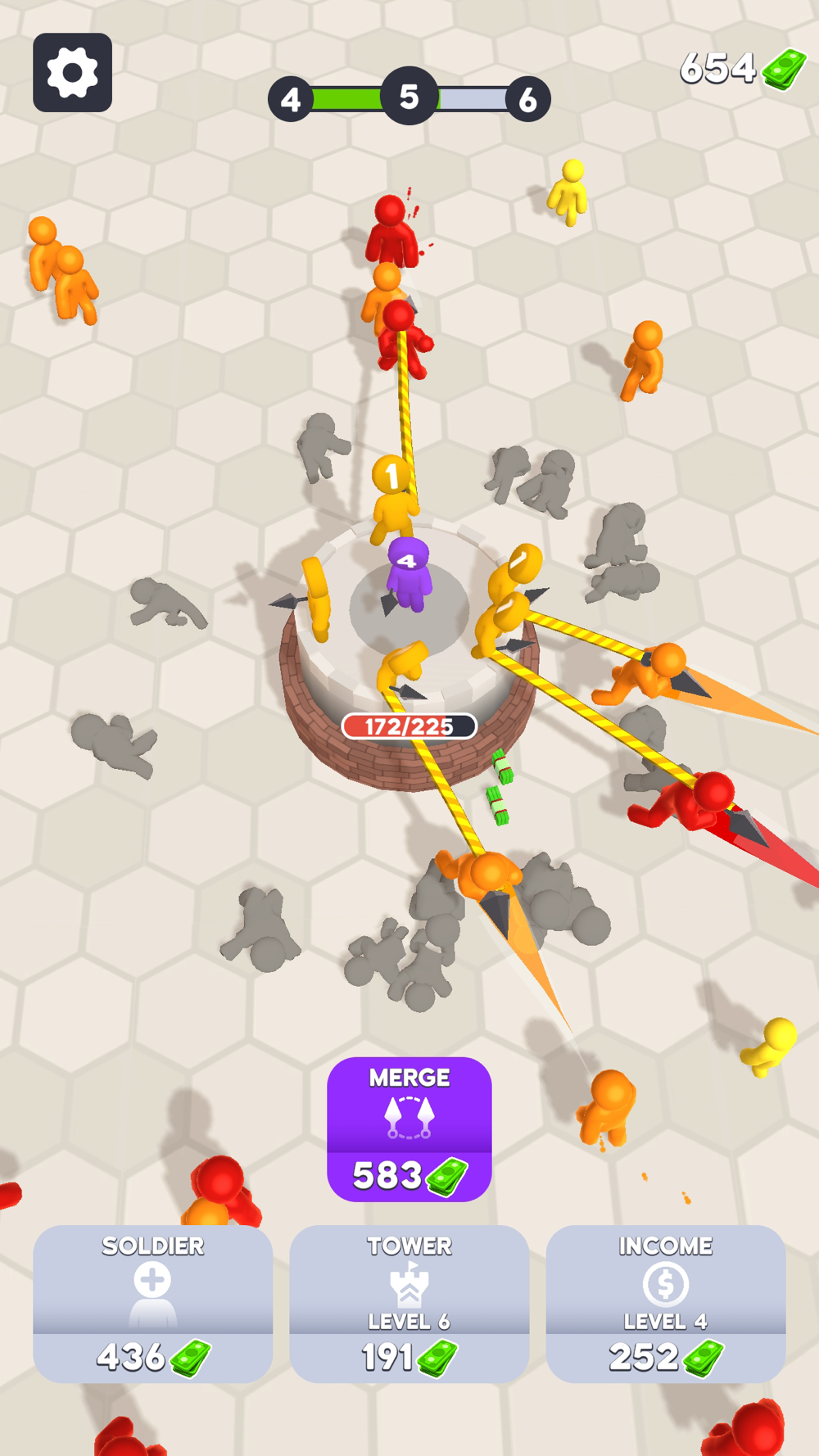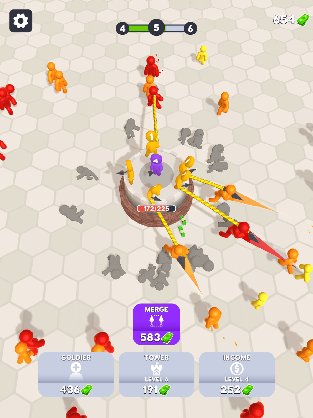 To defeat the enemies, use your ropes. Upgrade your base, buy new soldiers and merge them.