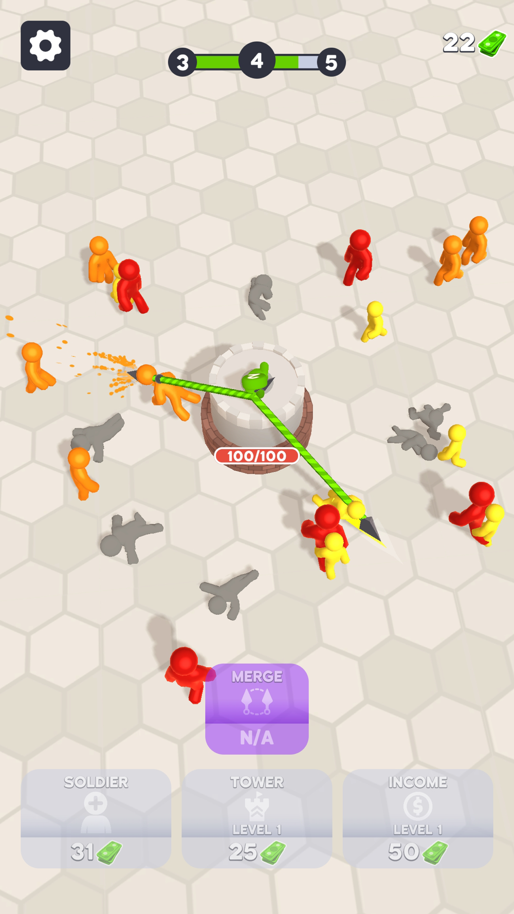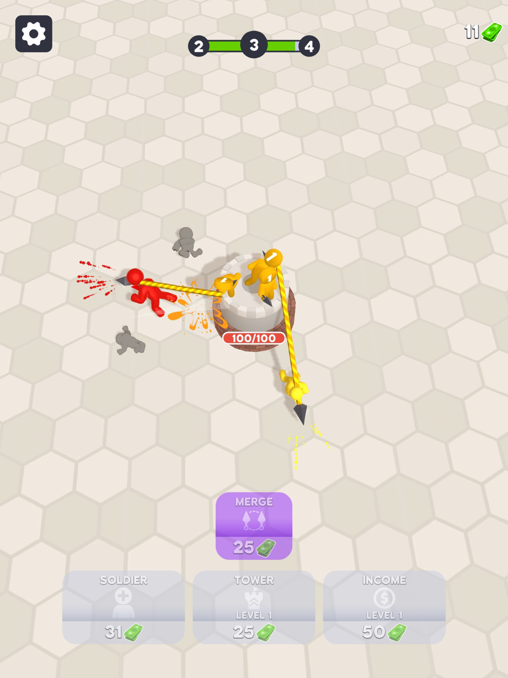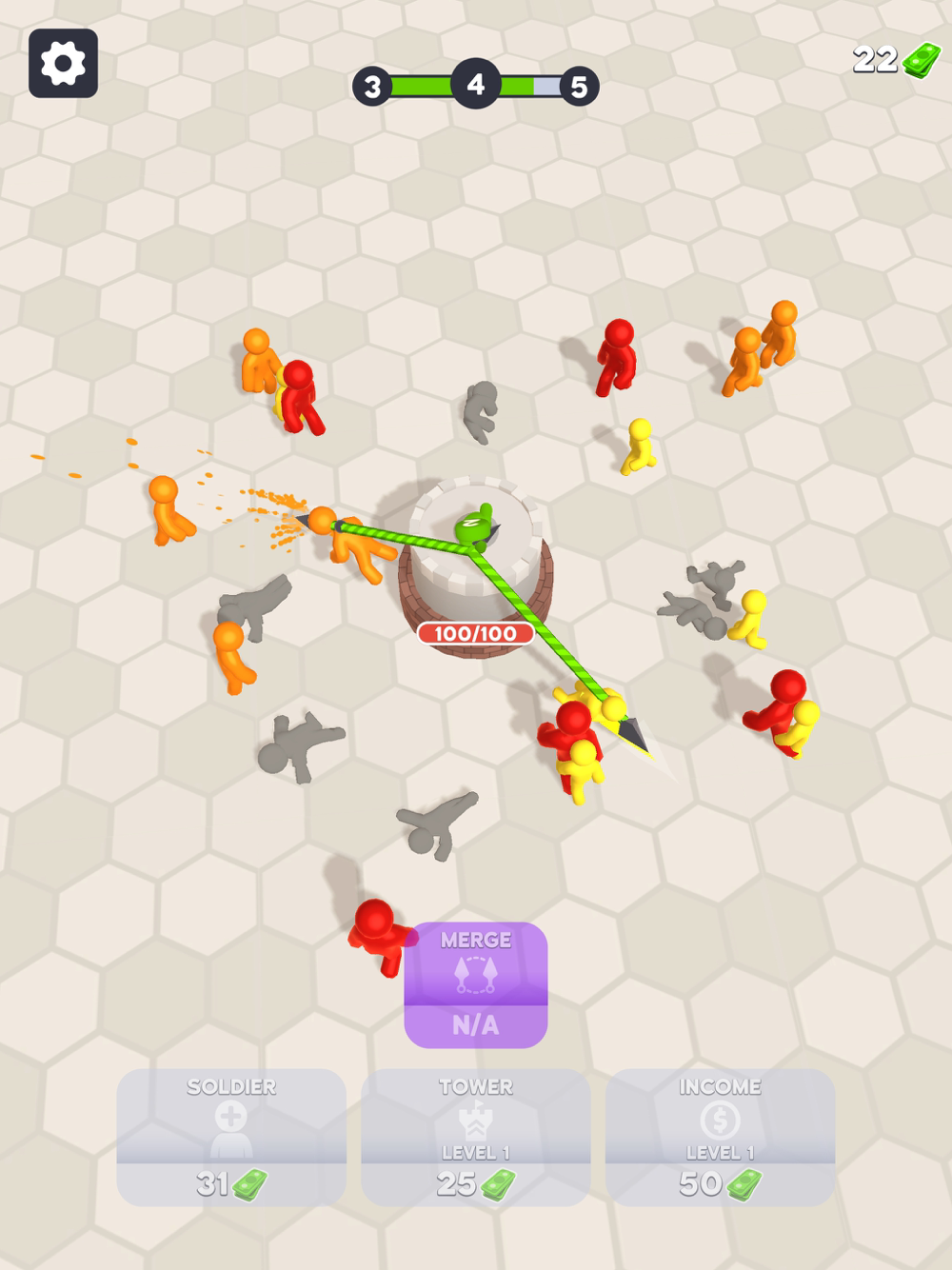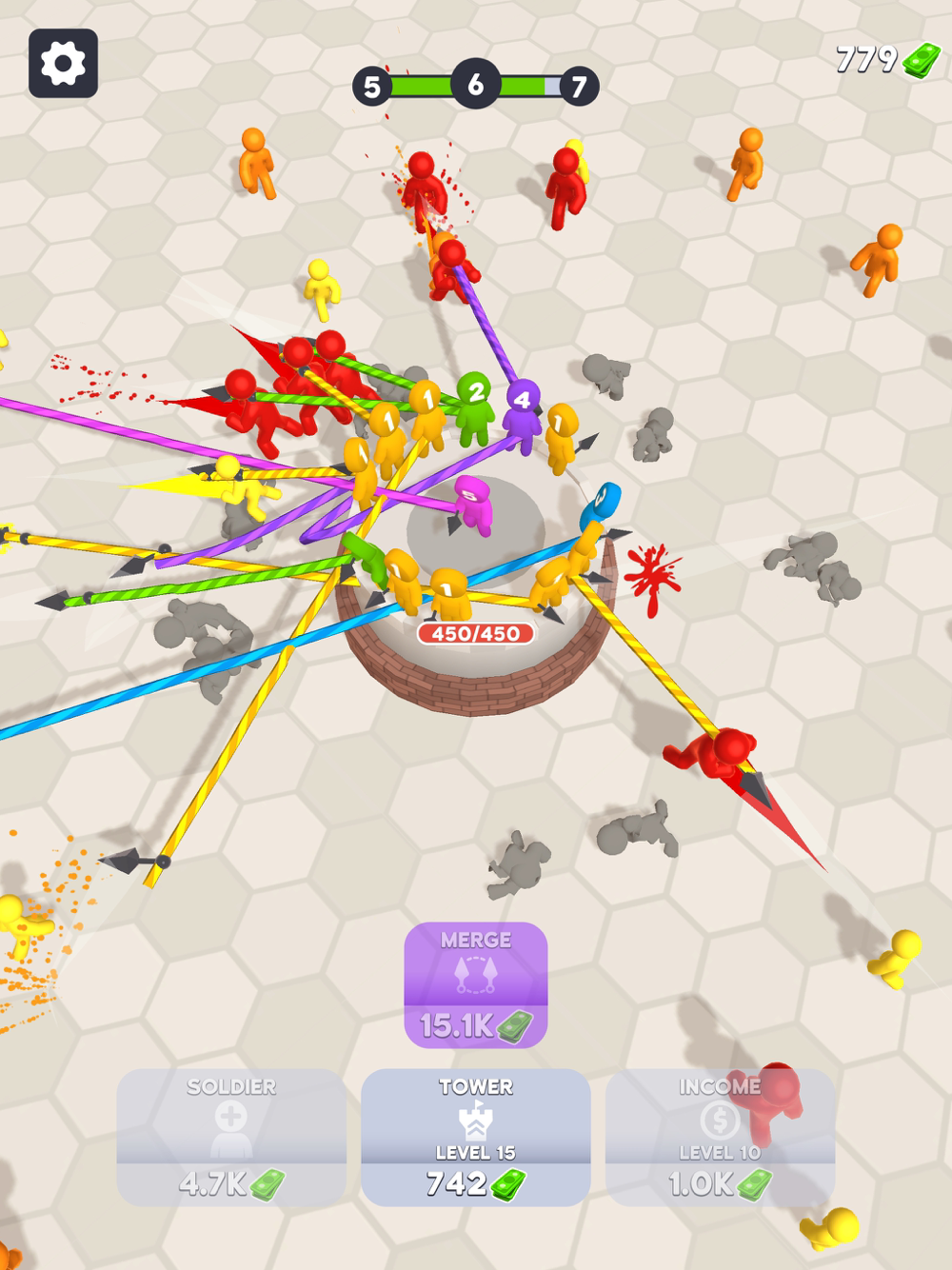 To defeat the enemies, use your ropes. Upgrade your base, buy new soldiers and merge them.