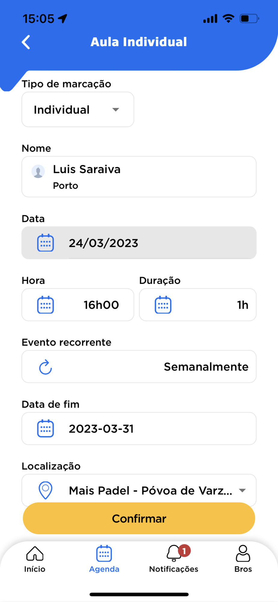 Disponibilização e Marcação de Treinos Individuais ou de Grupo - A agenda permite um controlo da tua disponibilidade e de uma rápida conexão entre o PT e os clientes, facilitando a marcação de sessões tanto individuais como de grupo;