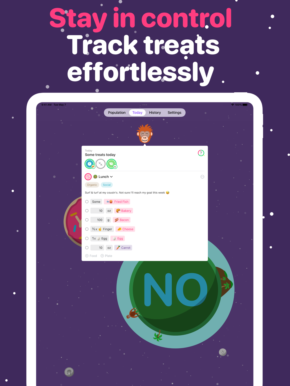 Have a day when things don’t go so well? No problem, we’re all human (except the apes, of course!). Tracking doesn’t have to be judgmental — diets can often be unsustainable because they ask too much of us. Unlike some habit-tracking apps, you won’t have to start all over again — and your apes are always just a few clean days away from returning. What’s more, those full days don’t have to be consecutive — they can be made up of several meals over multiple days.