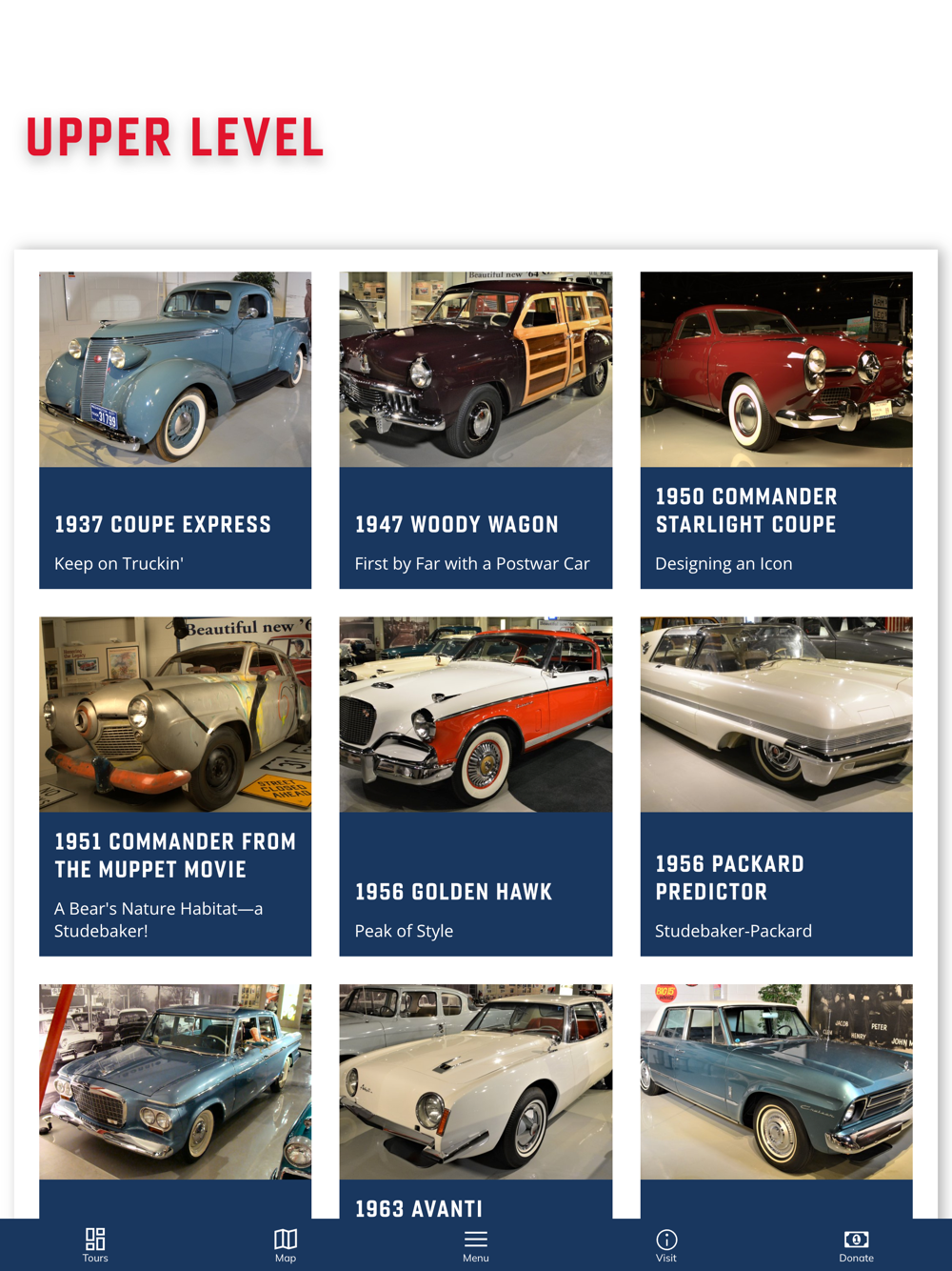 Access rich content about the Museum’s extensive permanent collection, archival images, videos, and more during your museum visit. Explore the Studebaker story and treasures of the museum’s vehicle collection with the Highlights Tour, take a closer look at the stuff you can’t normally see with the Under the Hood Tour, and search for hidden clues and complete challenges with the Scavenger Hunt.