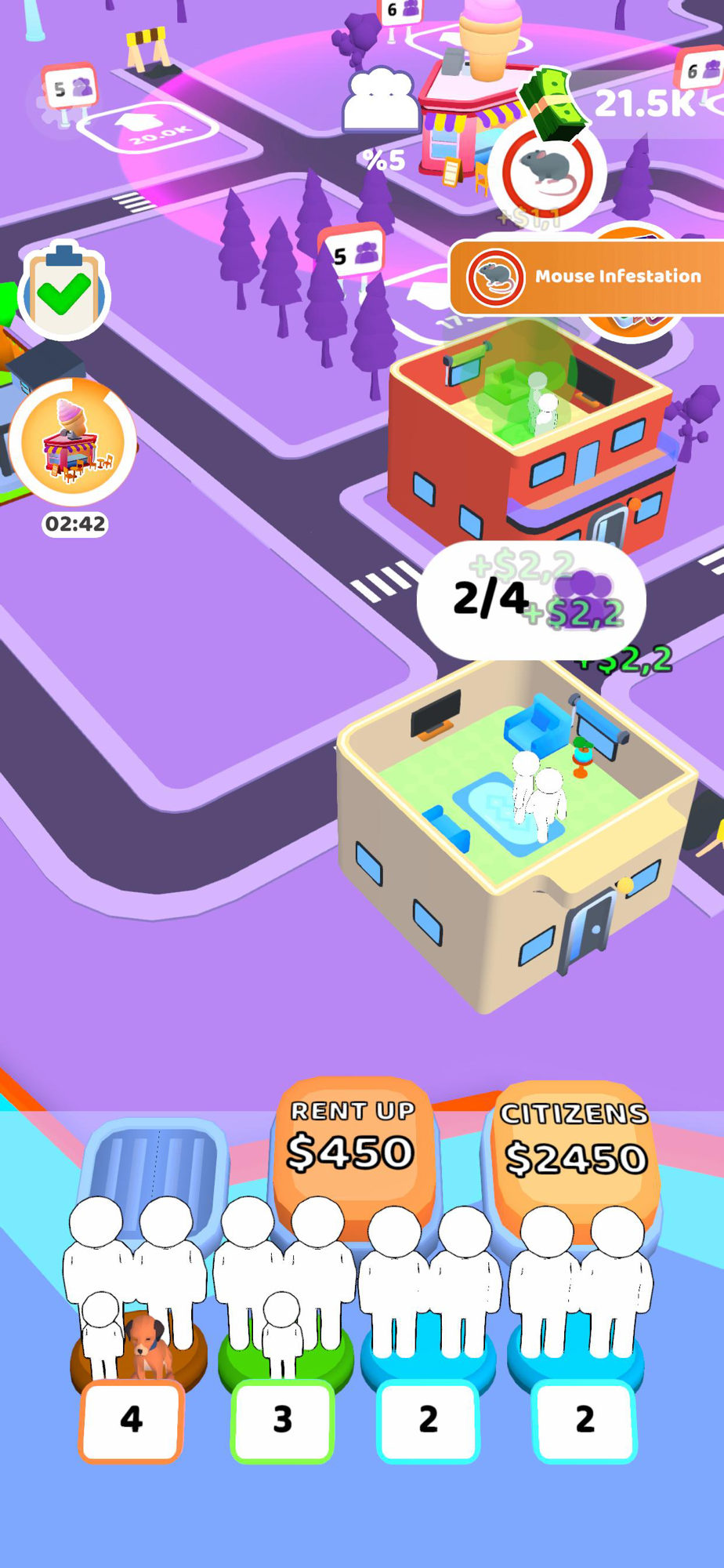 Merge citizens and put them into one of your houses as renters! Purchase new houses and grow your business. Don't forget to pay attention to any problem your properties might have, like electric outages.