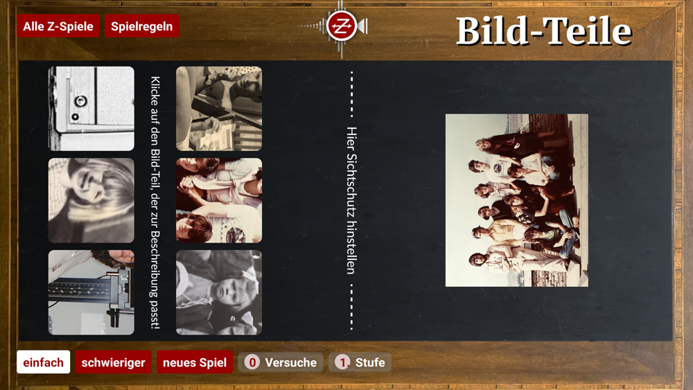 Raten und sich erinnern mit Bildern und Erinnerungen aus dem Generationenspiel Zeitmaschine.TV. Die drei Spiele rufen dynamisch Tonspuren und Fotos von aus der Datenbank ab und sprechen dabei verschiedene Sinne an. Alle drei Spiele können mit BewohnerInnen-Gruppen gespielt werden, indem sie auf einen grossen Screen übertragen werden. Auf iPad und Tablet werden «Zeit-Reihe» und «Hör-Spiel» alleine und «Bild-Teile» zu zweit gespielt.