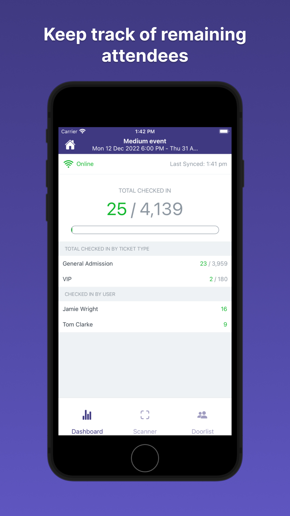 - Check in attendees by scanning their tickets, searching for personal details, or selecting from a door list.