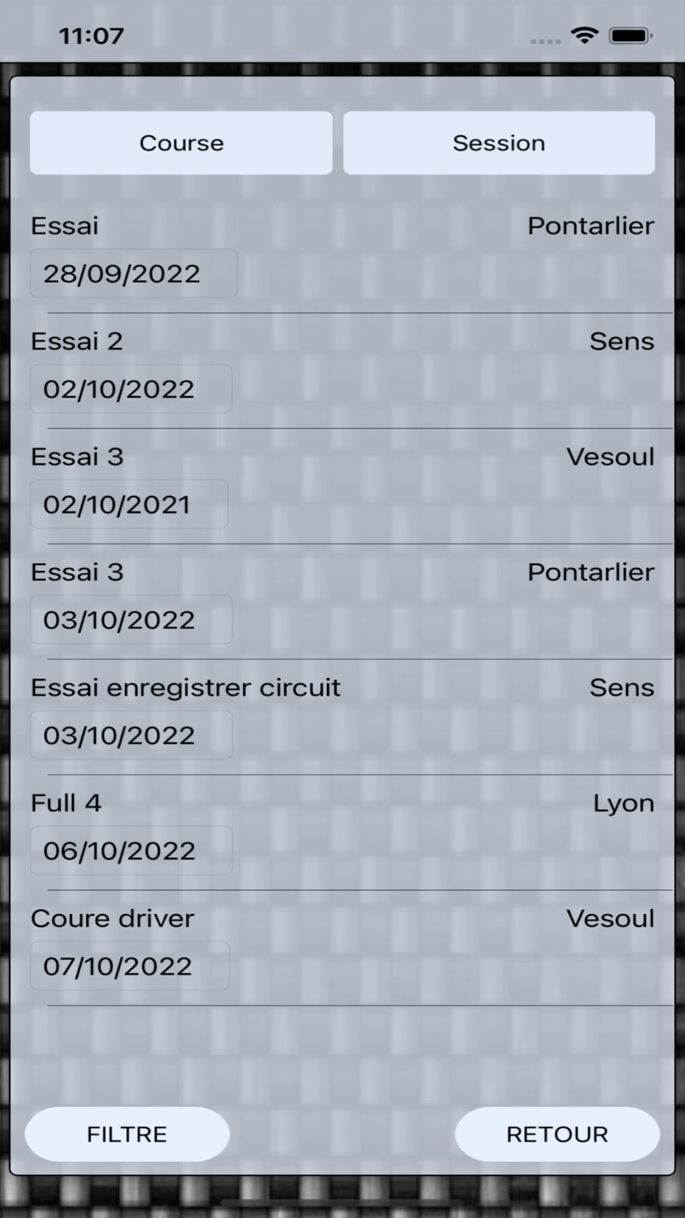 Chaque résultats peuvent être enregistré, séparément ou par course complète, vous pouvez les visualiser plus tard dans votre liste de session ou de courses que vous pouvez filtrer par nom de pilotes, circuit ou date.