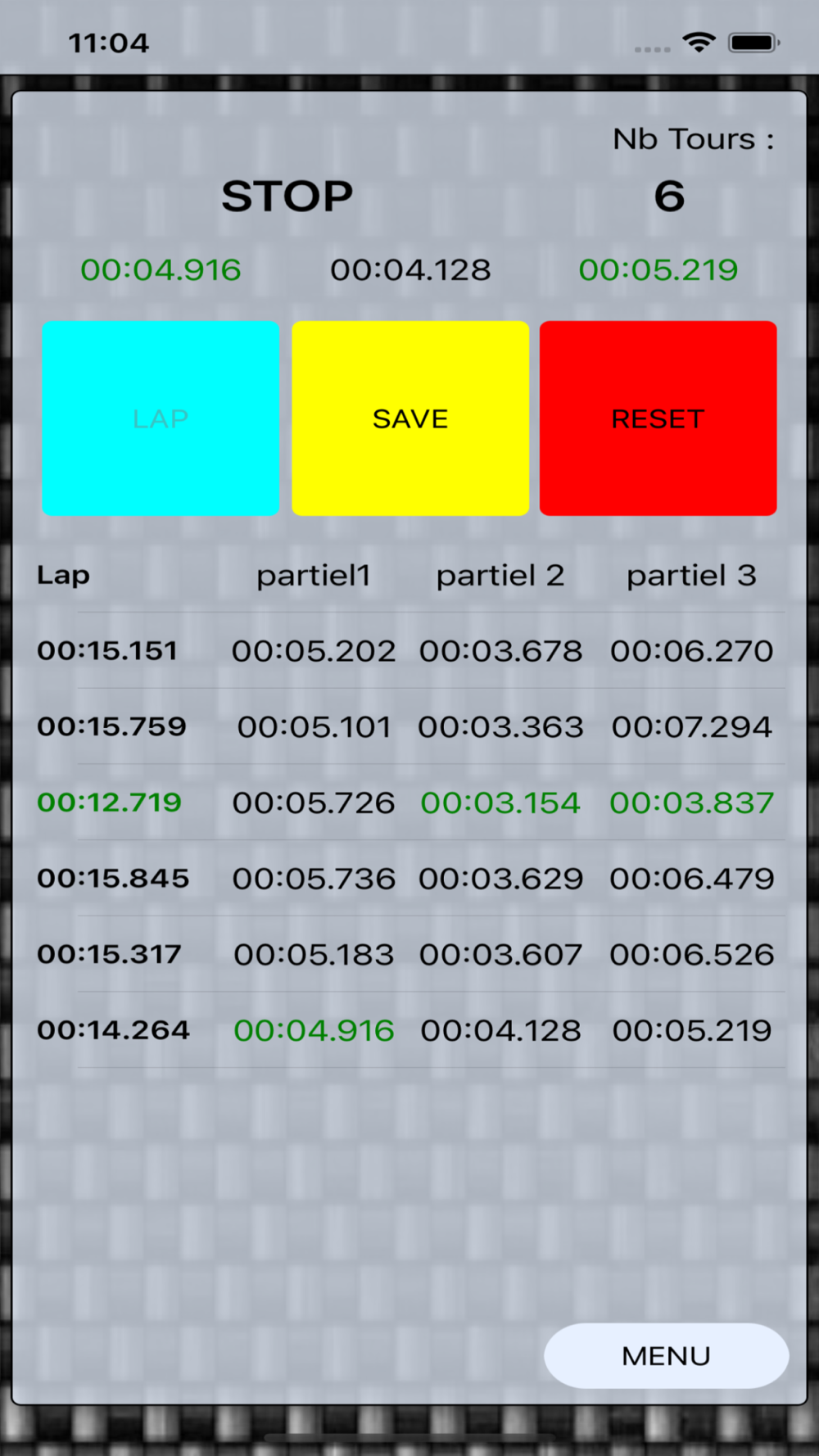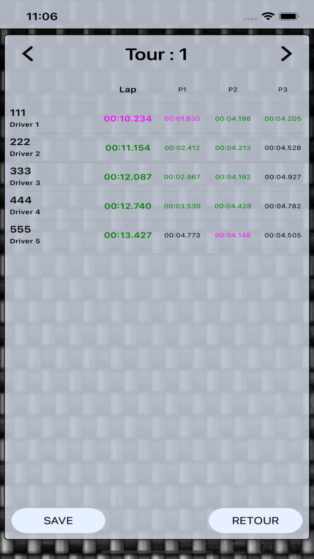 Race : permet de chronométrer plusieurs concurrent sur 1, 2, ou 3 partiels et d'enregistrer leurs temps, plus adapter à la course il permet de démarrer tous les chronos en même temps, et de défiler les concurrent en fonction de leurs positions théorique sur le circuit.