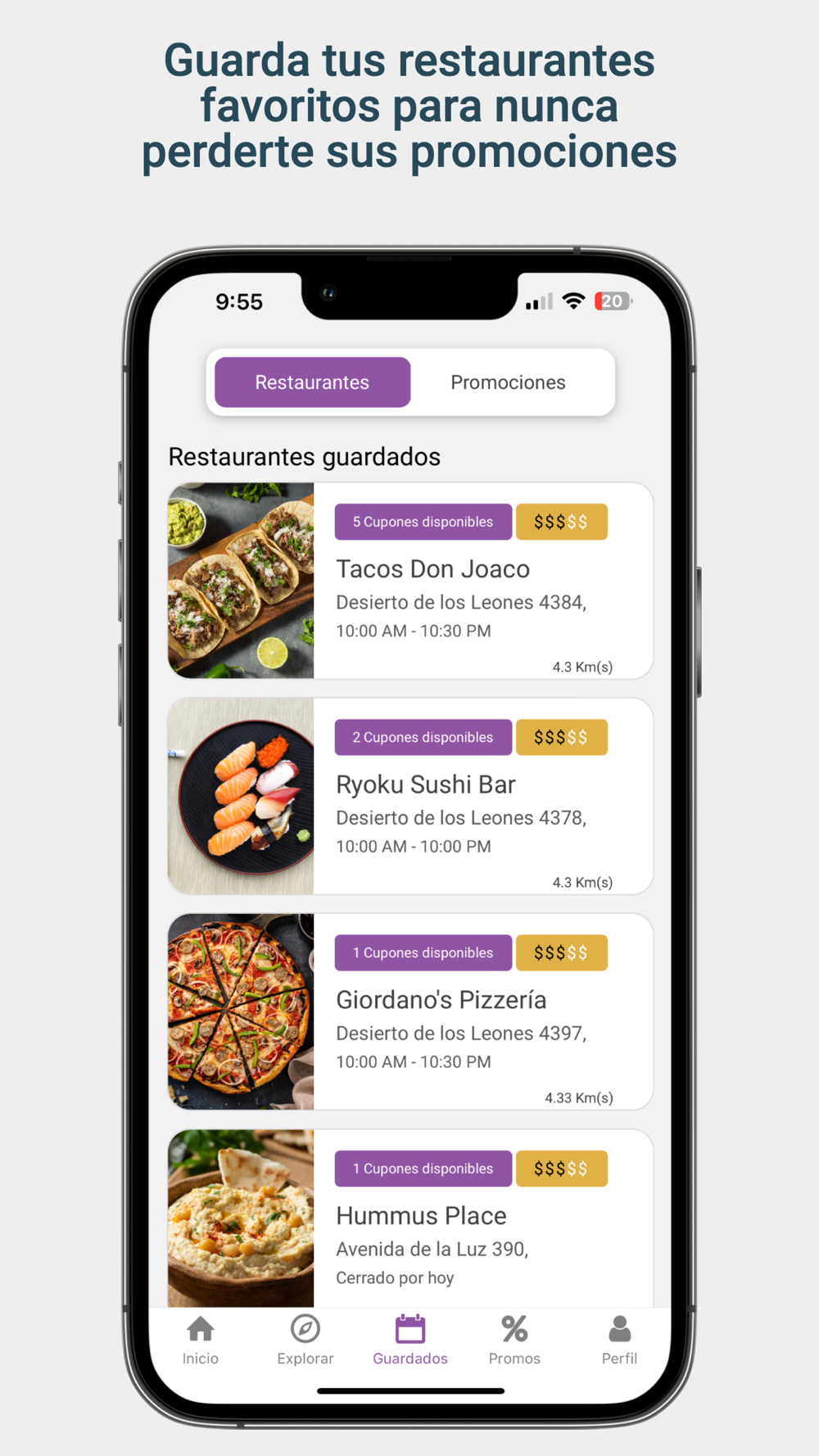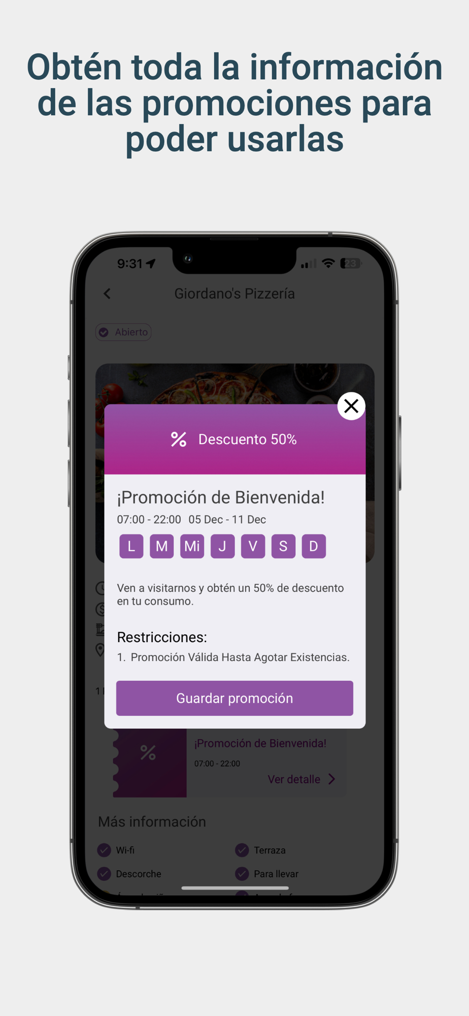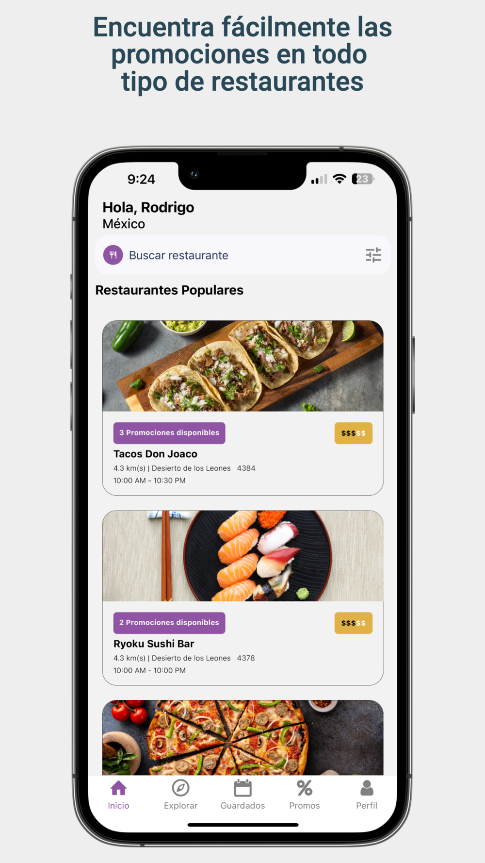 Simplemente descarga el app, ve las promociones cercanas a ti y, ¡disfruta pagando menos en tus restaurantes favoritos!