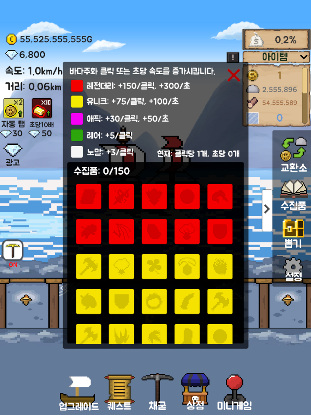 - 수집품: 노말/레어/에픽/유니크/레전더리로 나눠진 수집품을 모아 더욱 더 빠르게 바다주화를 획득해보세요