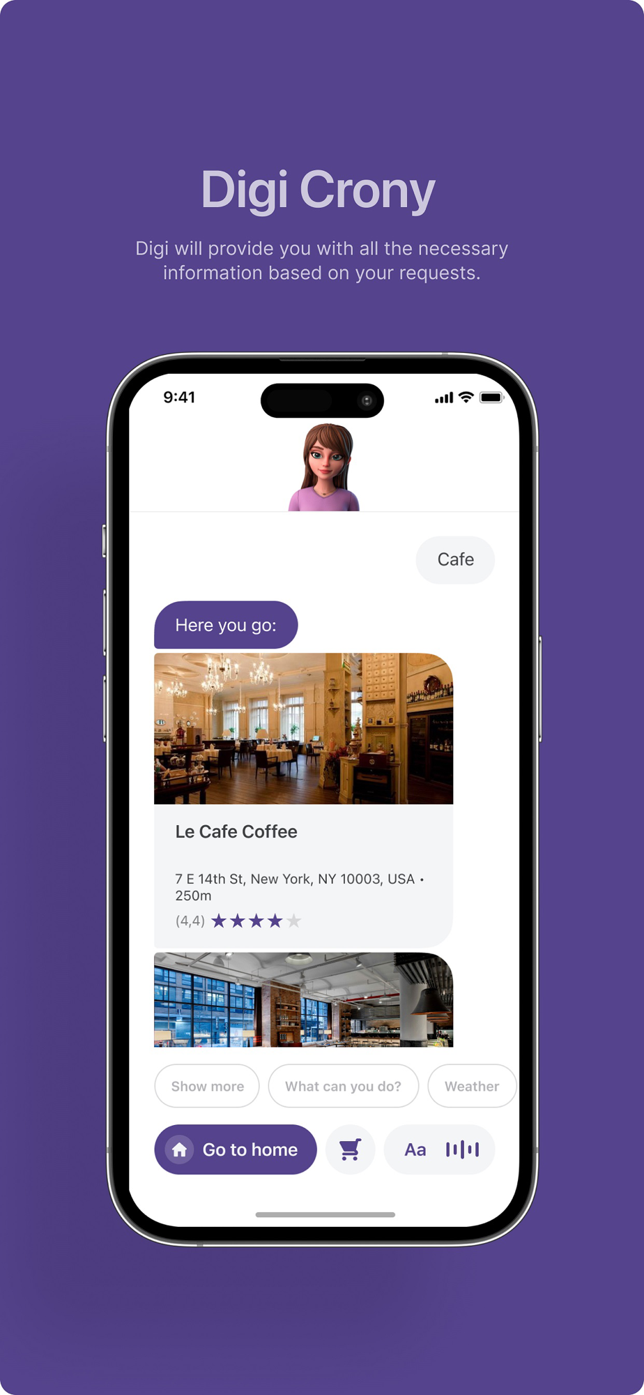 Meet Digi-Crony a digital friend that can fit anyone! Got bored of being at home or want to arrange a date or a friend meet? Leave it to Digi! It will reserve a table at a cafe or restaurant, buy you a movie ticket, help to find nearby places of interest, and plan your day with reminders.