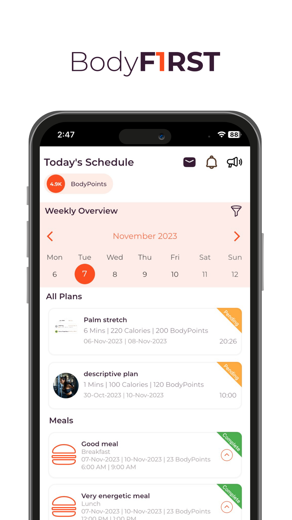 BodyF1rst powered by Ageless Humans is earn while you burn mobile application that encourages daily behavior changes for long-term health and wellness. Earn BodyPoints for every task you complete. Stay competitive and connected with our members, coaches, and sponsors all while holding yourself accountable to your goals. Bodyf1rst focuses on our core 4 principles to help you achieve your goals: fitness, mindset, nutrition, and spiritual growth. Our proprietary approach taps into Cognitive Behavioral Science to foster healthy habits and offers a team of health experts and coaches to guide you along the way.