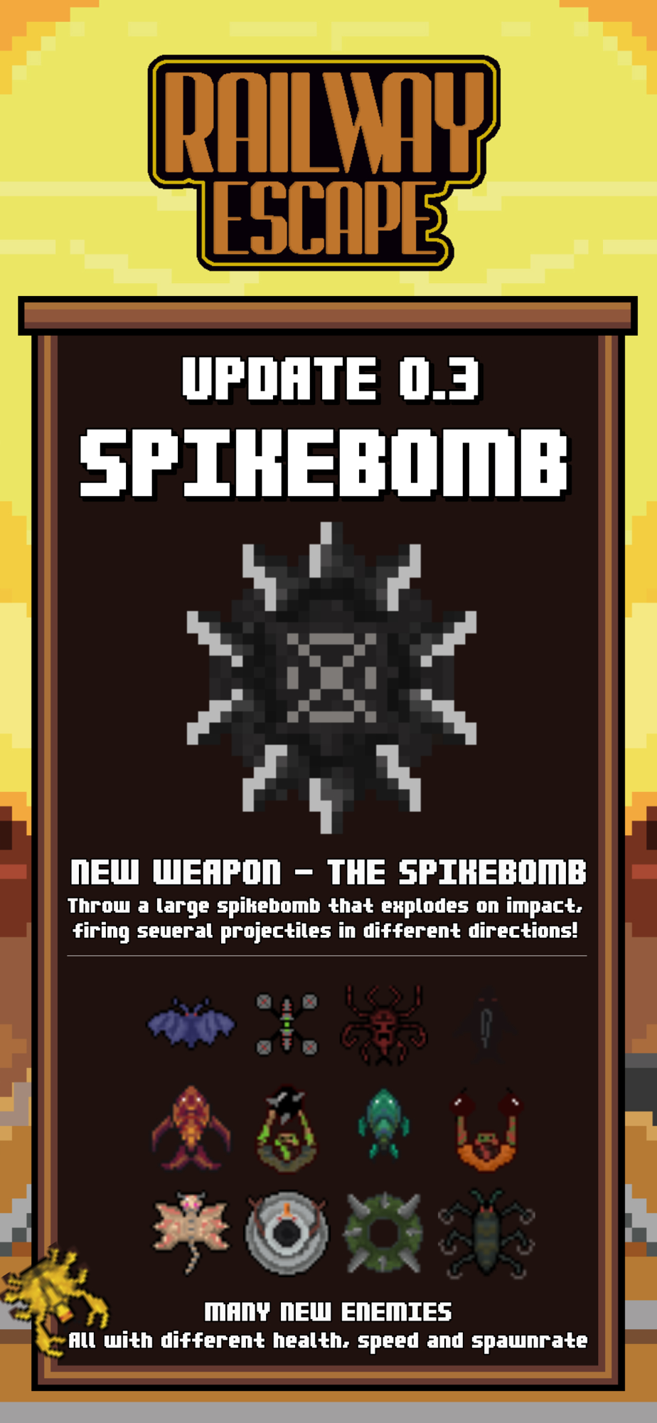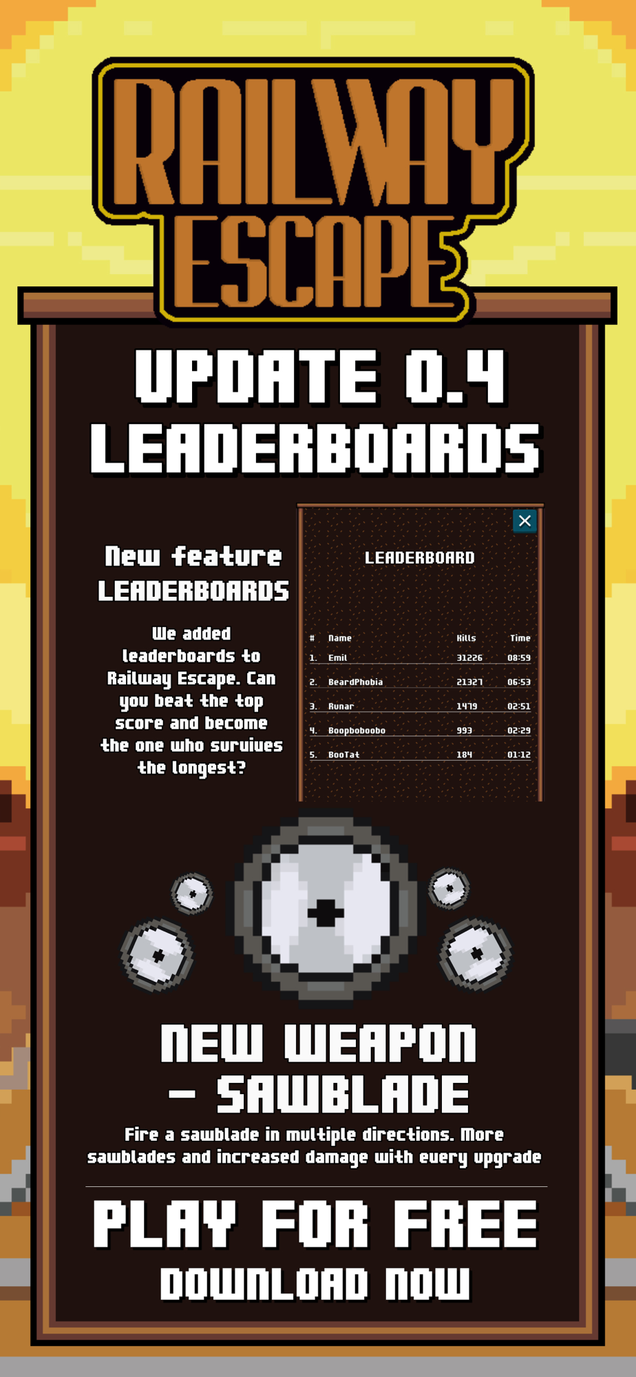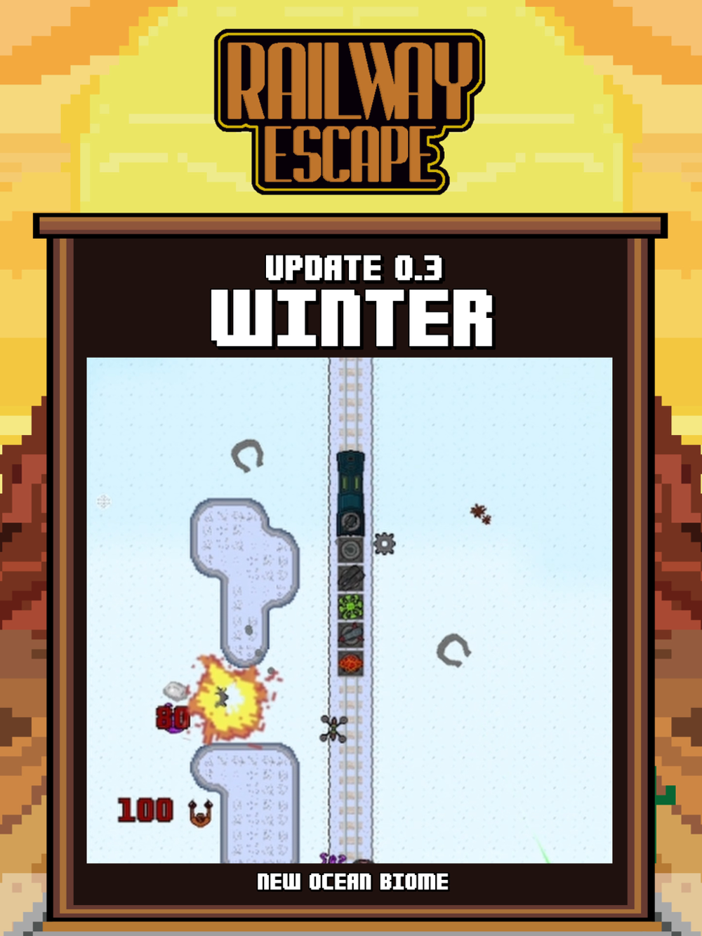 Battle hundreds of monsters and survive as long as you can in Railway Escape. Protect your train at all costs and upgrade your arsenal of weapons to become more powerful in this Bullet Hell game. It is up to you to clear a path to safety for you and the passengers on the last train to freedom on earth. Exciting gameplay, hordes of monsters, many weapon combinations and thrilling music will make Railway Escape your goto game when you have a few minutes to spare.