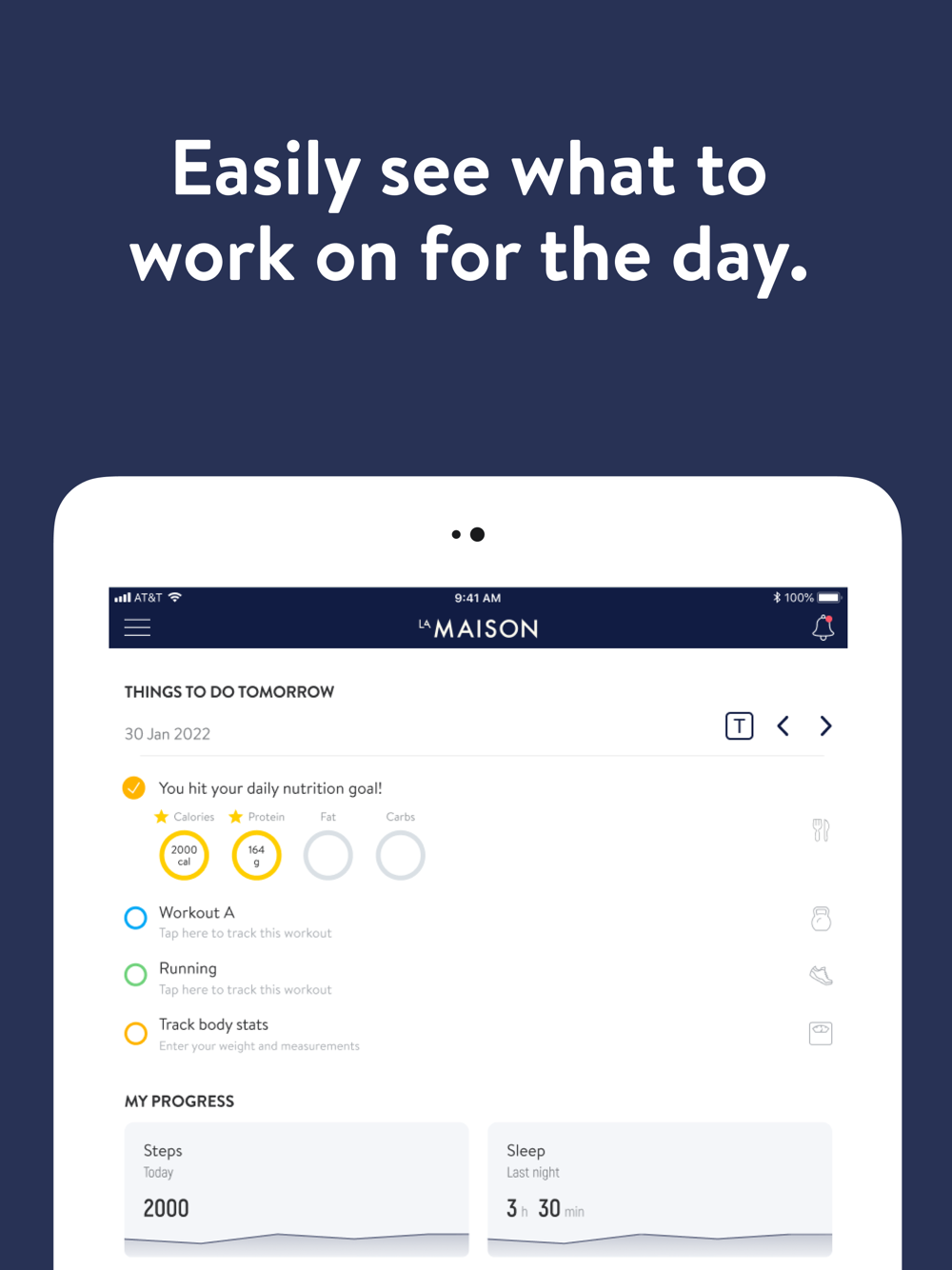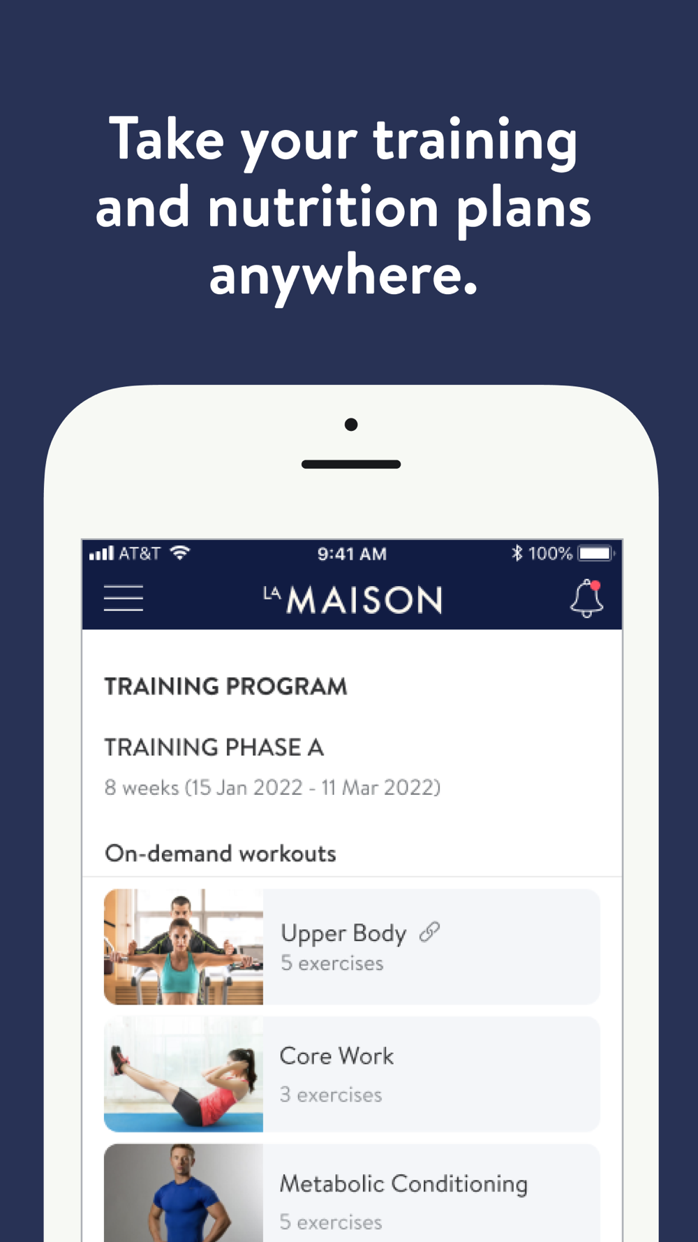 With the La Maison Personal Training App, you will have access to workout programs designed specifically to help you reach your fitness and health goals! You can follow & track your workouts, your nutrition, your lifestyle habits, measurements and results–all with the help of your coach.